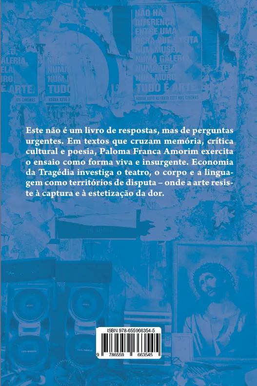 O ensaio é um gênero solidário com as histórias que queremos contar e é solidário às reflexões sobre o mundo e nossa presença diversa no mundo. Essa ideia é de Paloma Franca Amorim e está aqui neste volume extremamente instigante intitulado Economia da tragédia. A partir dessa camaradagem que o ensaio permite, Paloma costura algumas imagens e suas interpretações, elabora e comenta sobre os modos de fabricação de alguns objetos culturais contemporâneos, sua recepção pessoalíssima e abrangente, e os efeitos de seus desdobramentos críticos.