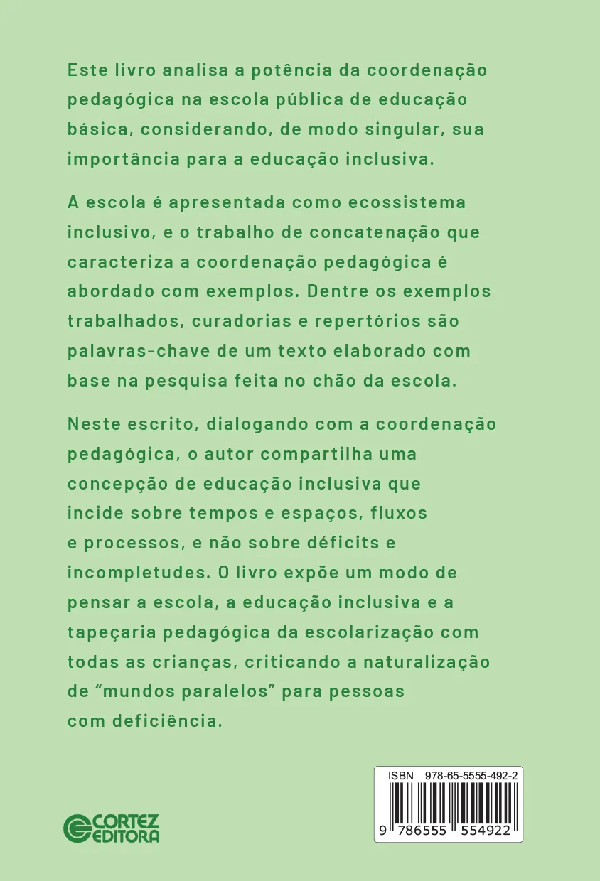 Este livro analisa a potência da coordenação pedagógica na escola pública de educação básica, considerando, de modo singular, sua importância para a educação inclusiva.