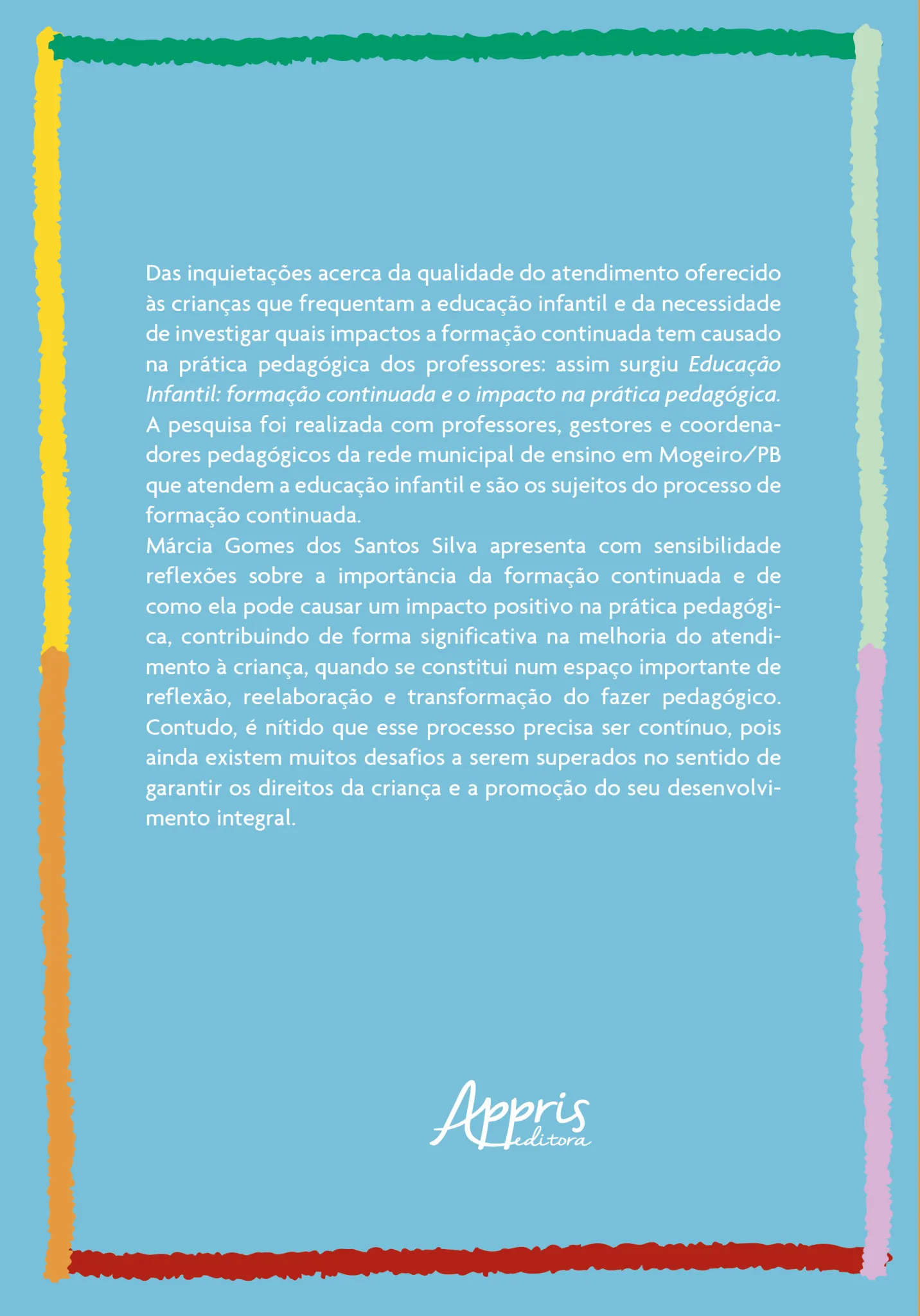 Márcia Gomes dos Santos Silva apresenta com sensibilidade reflexões sobre a importância da formação continuada e de como ela pode causar um impacto positivo na prática pedagógica, contribuindo de forma significativa na melhoria do atendimento à criança, quando se constitui num espaço importante de reflexão, reelaboração e transformação do fazer pedagógico. Contudo, é nítido que esse processo precisa ser contínuo, pois ainda existem muitos desafios a serem superados no sentido de garantir os direitos da criança e a promoção do seu desenvolvimento integral.