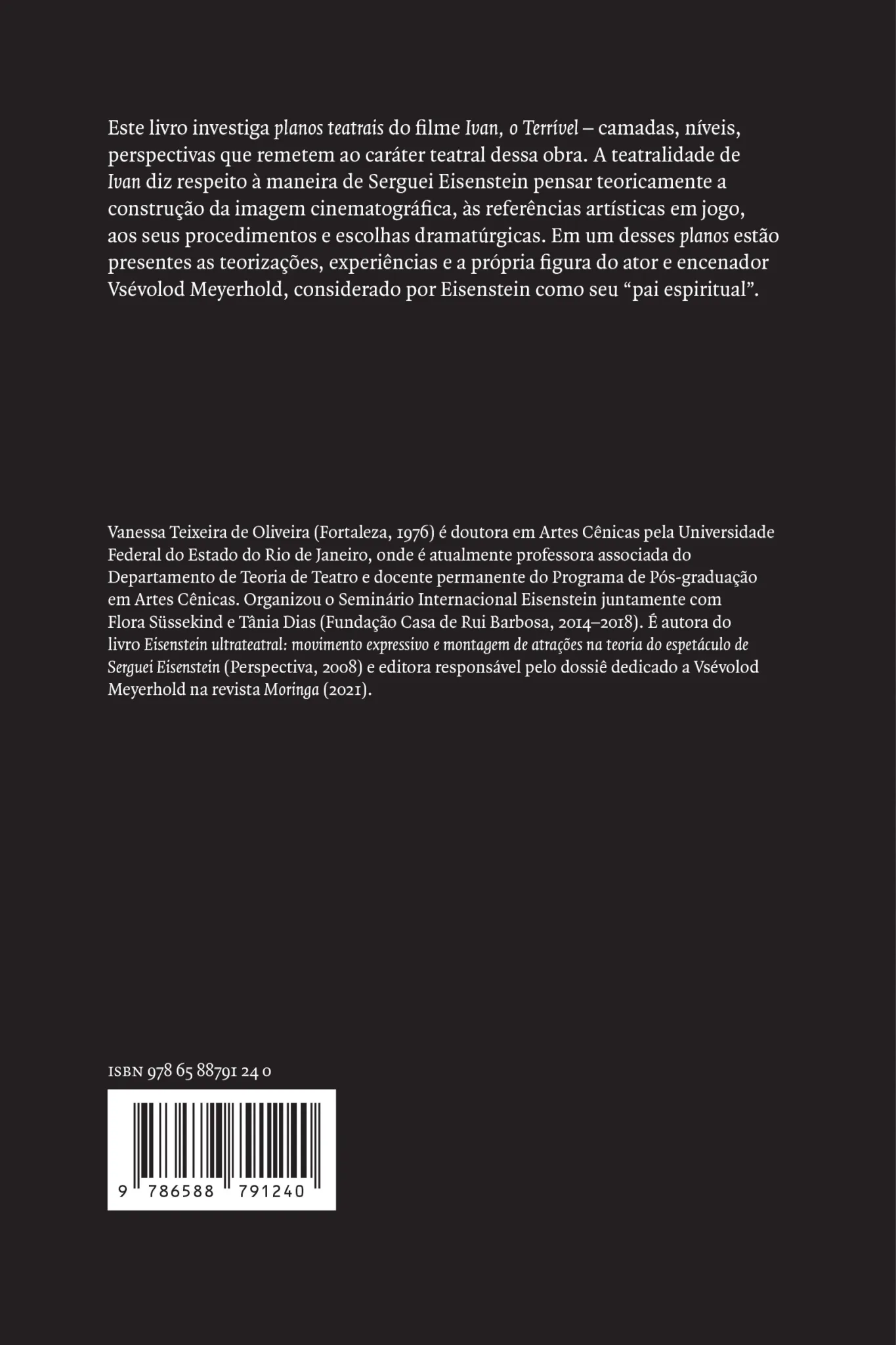 Este livro investiga planos teatrais do filme, Ivan, o Terrível – camadas, níveis, perspectivas que remetem ao caráter teatral dessa obra. A teatralidade de Ivan diz respeito à maneira e Serguei Eisensteis pensar teoricamente a construção da imagem cinematográfica, às referências artísticas em jogo, aos seus procedimentos e escolhas dramatúrgicas. Em um desses planos estão presentes teorizações, experiências e a própria figura do ator e encenador Vsévolod Meyerhold, considerado por Eisenstein como seu “pai espiritual”