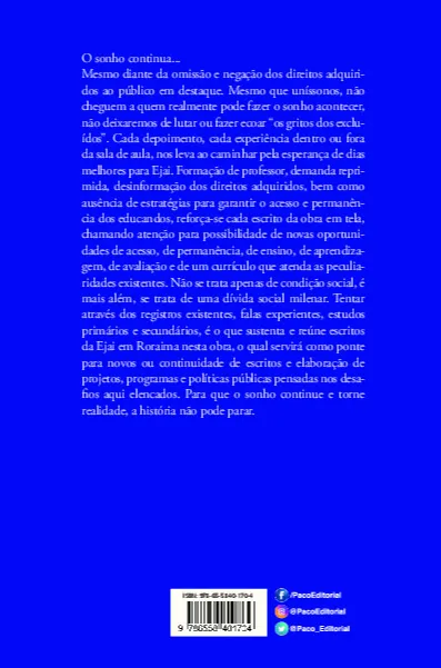 A presente obra tem como objetivo, além de apresentar à Educação de Jovens, Adultos e Idosos de Roraima (Ejai), os seus principais desafio e implicações, também investigar e discutir as políticas públicas que representam esta modalidade de ensino, considerando questões como formação de professor, a pouca demanda, desinformação dos direitos adquiridos e a falta de estratégias para garantir o acesso e permanência dos alunos em sala de aula.