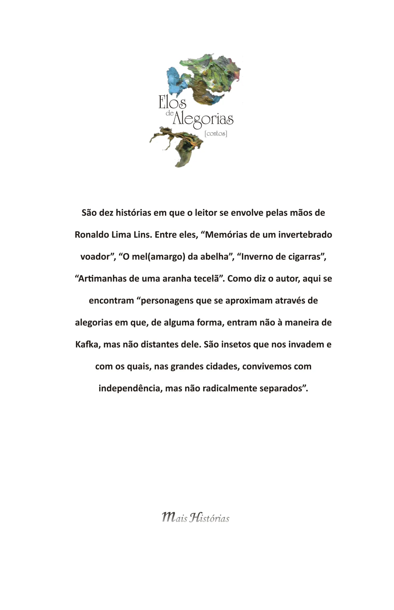 São personagens que se aproximam através de alegorias em que, de alguma forma, entram não à maneira de Kafka, mas não distantes dele. São insetos que nos invadem e com os quais, nas grandes cidades, convivemos com independência, mas não radicalmente separados. É, entre outras coisas, o que lhes dá substância particular, quando procuramos nossas verdades e, com incômoda persistência, elas se ocultam, rejeitando nossos esforços e, ao mesmo tempo, estimulando-os. Com frequência, buscamos traços de humanidade nos quais as identidades se fazem múltiplas. Reconhecê-las é, com certeza, senão um ponto inicial, sem dúvida uma instância de crescimento. Nunca chegaremos bastante longe sem que admitamos nossas pequenas dimensões. Afinal, há o todo no minúsculo e vice-versa. Elos de alegorias voam por essas vias.