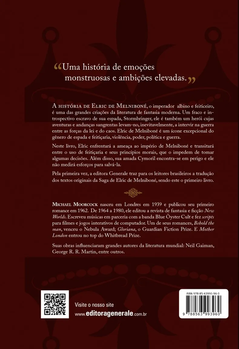 A história de Elric de Melniboné, o imperador albino e feiticeiro, é uma das grandes criações de fantasia moderna. Um fraco e introspectivo escravo de sua espada, Stormbringer, ele é também um herói cujas aventuras e andanças sangrentas levam-no, inevitavelmente, a intervir na guerra entre as forças da lei e do caos. Um clássico do gênero espada e feitiçaria. Neste livro, Elric enfrentará a ameaça ao império de Melniboné e transitará entre o uso da magia e seus princípios morais, que o impedem de tomar algumas decisões. Além disso, sua amada Cymoril encontra-se em perigo, e ele não medirá esforços para salvá-la.