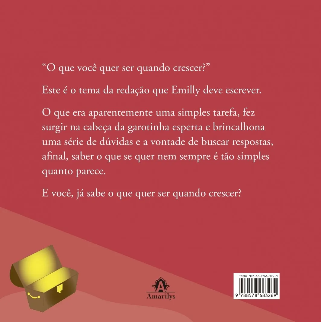 Este é o tema da redação que Emilly deve escrever. O que era aparentemente uma simples tarefa, fez surgir na cabeça da garotinha esperta e brincalhona uma série de dúvidas e a vontade de buscar respostas, afinal, saber o que se quer nem sempre é tão simples quanto parece. E você, já sabe o que quer ser quando crescer?