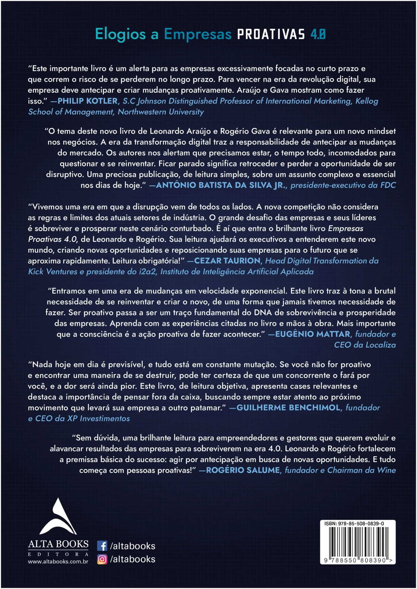 “Vivemos uma era em que a disrupção vem de todos os lados. A nova competição não considera as regras e limites dos atuais setores de indústria. O grande desafio das empresas e seus líderes é sobreviver e prosperar neste cenário conturbado. É aí que entra o brilhante livro Empresas Proativas 4.0, de Leonardo e Rogério. Sua leitura ajudará os executivos a entenderem este novo mundo, criando novas oportunidades e reposicionando suas empresas para o futuro que se aproxima rapidamente. Leitura obrigatória!” – CEZAR TAURION, Head Digital Transformation da Kick Ventures e presidente do i2a2, Instituto de Inteligência Artificial Aplicada.