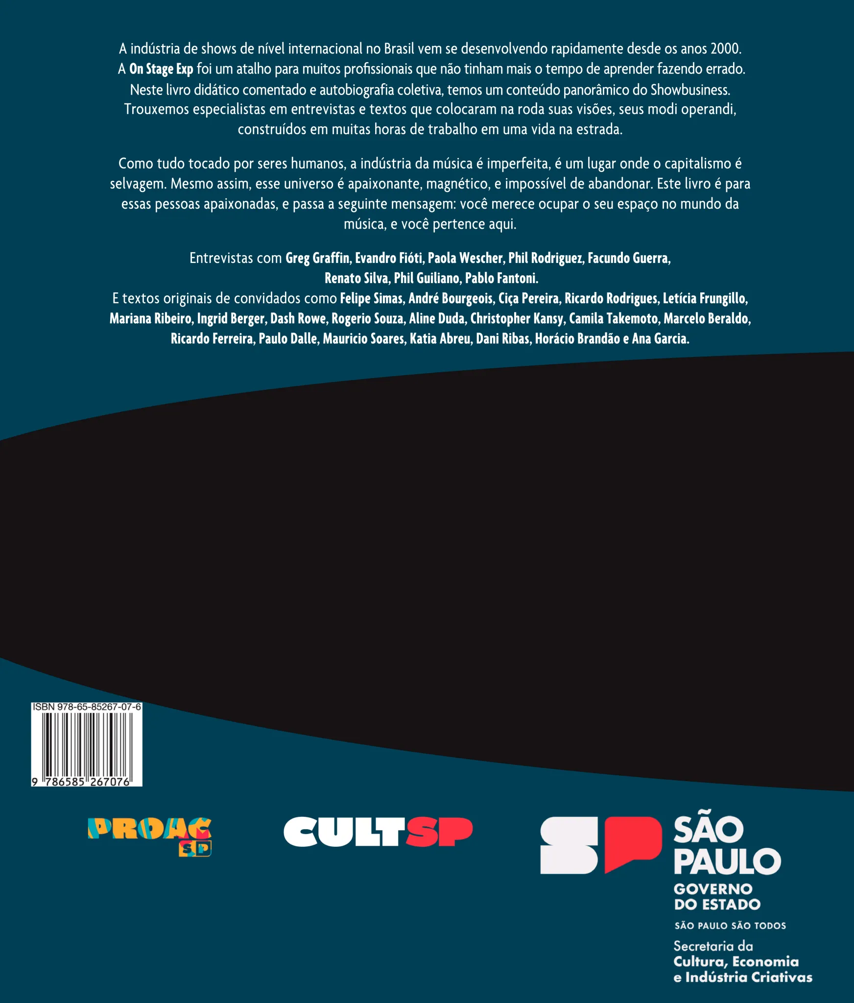 A indústria de shows de nível internacional no Brasil vem se desenvolvendo rapidamente desde os anos 2000. A On Stage Exp foi um atalho para muitos profissionais que não tinham mais o tempo de aprender fazendo errado. Neste livro didático comentado e autobiografia coletiva, temos um conteúdo panorâmico do Showbusiness. Trouxemos especialistas em entrevistas e textos que colocaram na roda suas visões, seus modi operandi, construídos em muitas horas de trabalho em uma vida na estrada.