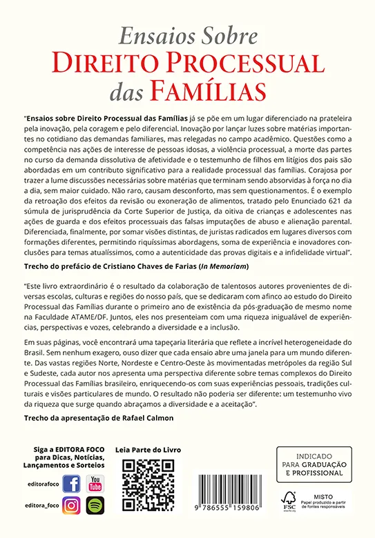 Em suas páginas, você encontrará uma tapeçaria literária que reflete a incrível heterogeneidade do Brasil. Sem nenhum exagero, ouso dizer que cada ensaio abre uma janela para um mundo diferente. Das vastas regiões Norte, Nordeste e Centro-Oeste às movimentadas metrópoles da região Sul e Sudeste, cada autor nos apresenta uma perspectiva diferente sobre temas complexos do Direito Processual das Famílias brasileiro, enriquecendo-os com suas experiências pessoais, tradições culturais e visões particulares de mundo. O resultado não poderia ser diferente: um testemunho vivo da riqueza que surge quando abraçamos a diversidade e a aceitação”.