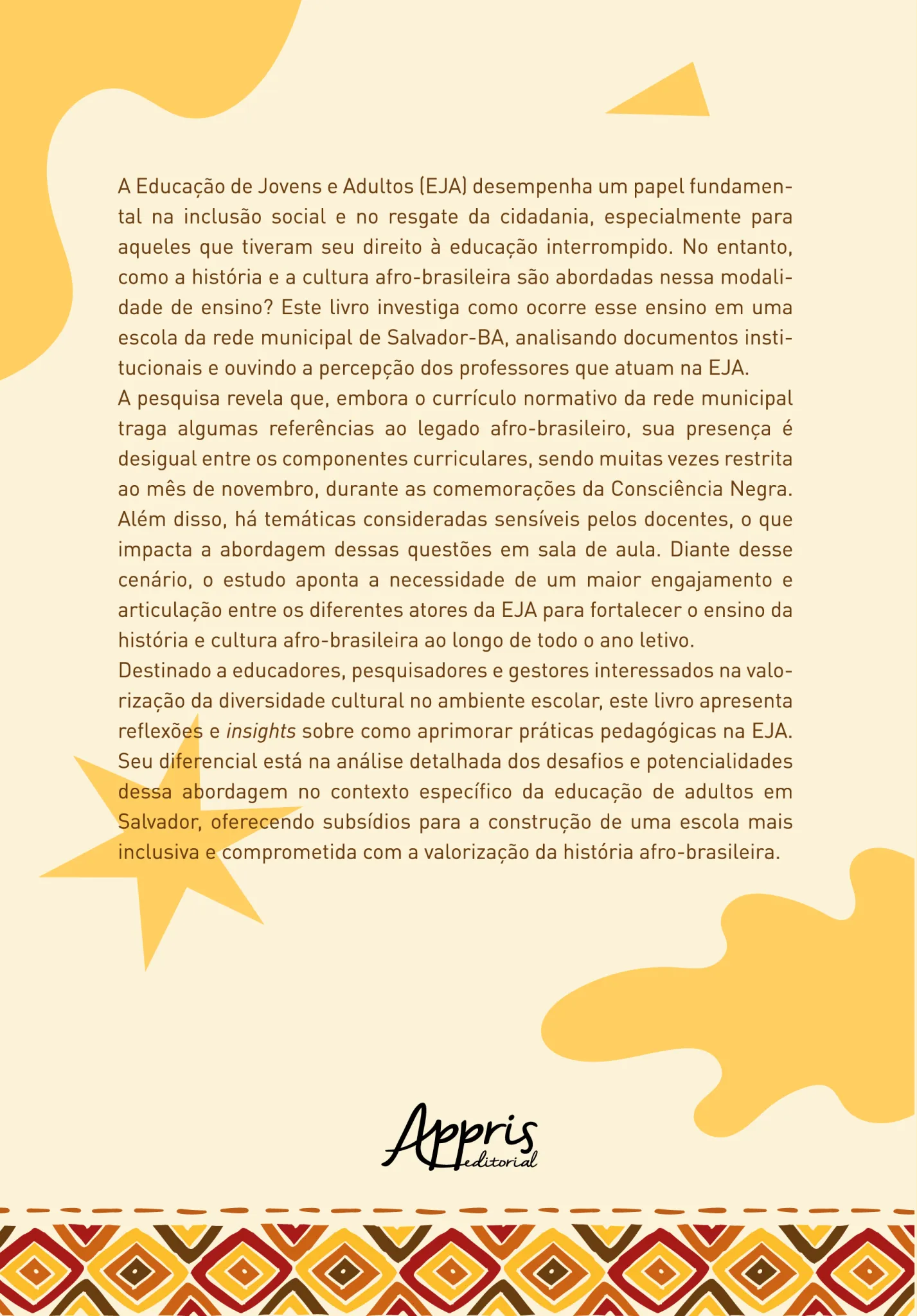A Educação de Jovens e Adultos (EJA) desempenha um papel fundamental na inclusão social e no resgate da cidadania, especialmente para aqueles que tiveram seu direito à educação interrompido. No entanto, como a história e a cultura afro-brasileira são abordadas nessa modalidade de ensino? Este livro investiga como ocorre esse ensino em uma escola da rede municipal de Salvador-BA, analisando documentos institucionais e ouvindo a percepção dos professores que atuam na EJA.