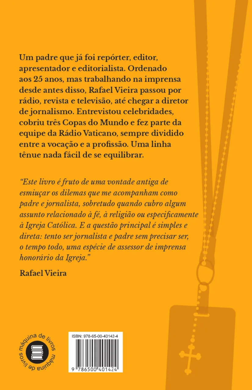 Um padre que já foi repórter, editor, apresentador e editorialista. Ordenado aos 25 anos, mas trabalhando na imprensa desde antes disso, Rafael Vieira passou por rádio, revista e televisão, até se tornar diretor de jornalismo. Tudo isso sem deixar de atuar como pároco, seja celebrando missas no Lago Sul, em Brasília, ou trabalhando próximo aos últimos três Papas. Com rara sinceridade, ele narra sua experiência de quase 40 anos como jornalista, que o levou a correr o mundo como repórter da Rádio Vaticano, como assessor de comunicação na prestigiada Conferência Nacional dos Bispos do Brasil e cobrindo três Copas do Mundo. Ao longo de sua trajetória, entrevistou também políticos, muitos artistas e foi pré-selecionado para a primeira edição do “Big Brother Brasil”, chegando a ser confinado num hotel até as vésperas da estreia do programa. A partir de episódios vividos desde os anos 1980 aos dias de hoje, padre Rafael fala de seus conflitos profissionais e das limitações de se equilibrar entre o sacerdócio e o jornalismo. “Entre a fé e os fatos” ajuda ainda a entender melhor a visão do clero sobre o trabalho da imprensa e vice-versa. A apresentação do livro é do jornalista Gerson Camarotti, da Globonews.