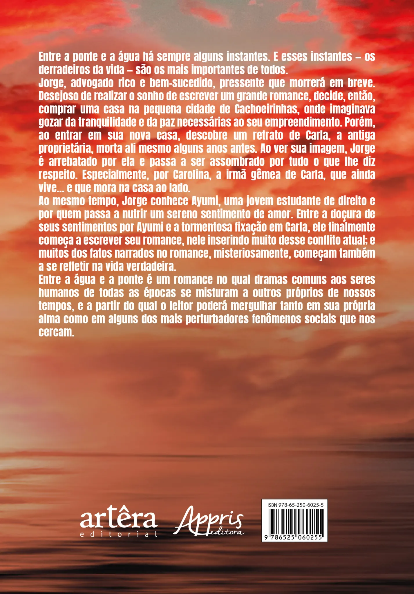 Entre a ponte e a água há sempre alguns instantes. E esses instantes — os derradeiros da vida — são os mais importantes de todos. Jorge, advogado rico e bem-sucedido, pressente que morrerá em breve. Desejoso de realizar o sonho de escrever um grande romance, decide, então, comprar uma casa na pequena cidade de Cachoeirinhas, onde imaginava gozar da tranquilidade e da paz necessárias ao seu empreendimento. Porém, ao entrar em sua nova casa, descobre um retrato de Carla, a antiga proprietária, morta ali mesmo alguns anos antes. Ao ver sua imagem, Jorge é arrebatado por ela e passa a ser assombrado por tudo o que lhe diz respeito. Especialmente, por Carolina, a irmã gêmea de Carla, que ainda vive… e que mora na casa ao lado. Ao mesmo tempo, Jorge conhece Ayumi, uma jovem estudante de direito e por quem passa a nutrir um sereno sentimento de amor. Entre a doçura de seus sentimentos por Ayumi e a tormentosa fixação em Carla, ele finalmente começa a escrever seu romance, nele inserindo muito desse conflito atual; e muitos dos fatos narrados no romance, misteriosamente, começam também a se refletir na vida verdadeira. Entre a água e a ponte é um romance no qual dramas comuns aos seres humanos de todas as épocas se misturam a outros próprios de nossos tempos, e a partir do qual o leitor poderá mergulhar tanto em sua própria alma como em alguns dos mais perturbadores fenômenos sociais que nos cercam.