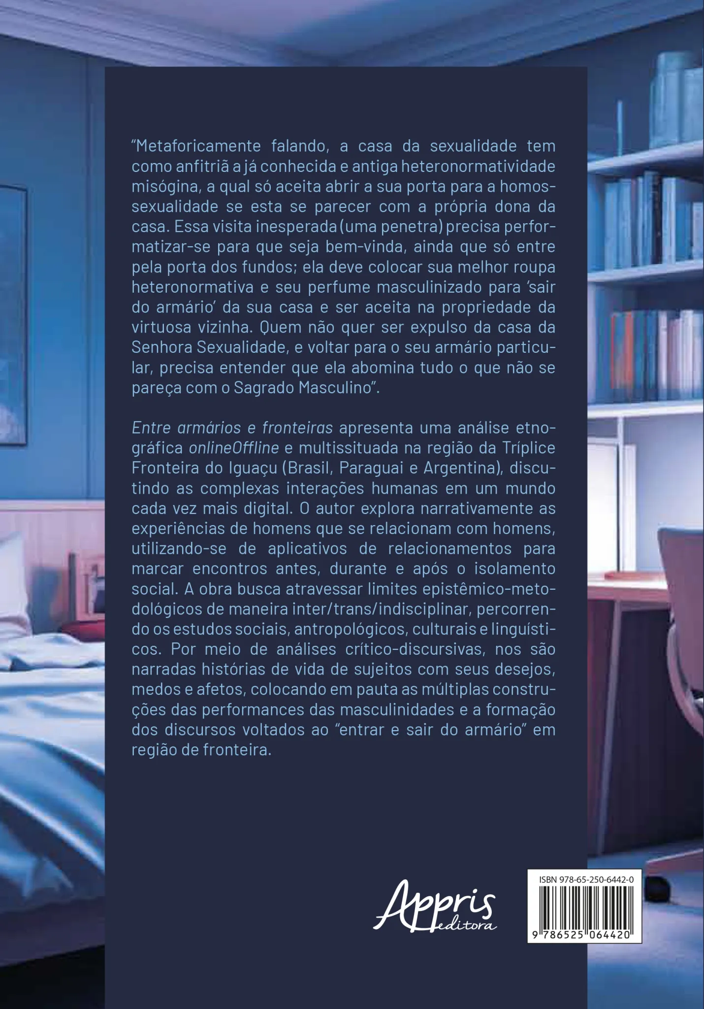 Entre armários e fronteiras apresenta uma análise etnográfica onlineOffline e multissituada na região da Tríplice Fronteira do Iguaçu (Brasil, Paraguai e Argentina), discutindo as complexas interações humanas em um mundo cada vez mais digital. O autor explora narrativamente as experiências de homens que se relacionam com homens, utilizando-se de aplicativos de relacionamentos para marcar encontros antes, durante e após o isolamento social. A obra busca atravessar limites epistêmico-metodológicos de maneira inter/trans/indisciplinar, percorrendo os estudos sociais, antropológicos, culturais e linguísticos. Por meio de análises crítico-discursivas, nos são narradas histórias de vida de sujeitos com seus desejos, medos e afetos, colocando em pauta as múltiplas construções das performances das masculinidades e a formação dos discursos voltados ao “entrar e sair do armário” em região de fronteira.