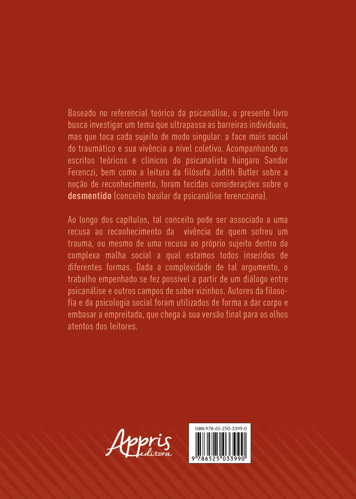 Baseado no referencial teórico da psicanálise, o presente livro busca investigar um tema que ultrapassa as barreiras individuais, mas que toca cada sujeito de modo singular: a face mais social do traumático e sua vivência a nível coletivo. Acompanhando os escritos teóricos e clínicos do psicanalista húngaro Sandor Ferenczi, bem como a leitura da filósofa Judith Butler sobre a noção de reconhecimento, foram tecidas considerações sobre o desmentido (conceito basilar da psicanálise ferencziana).
