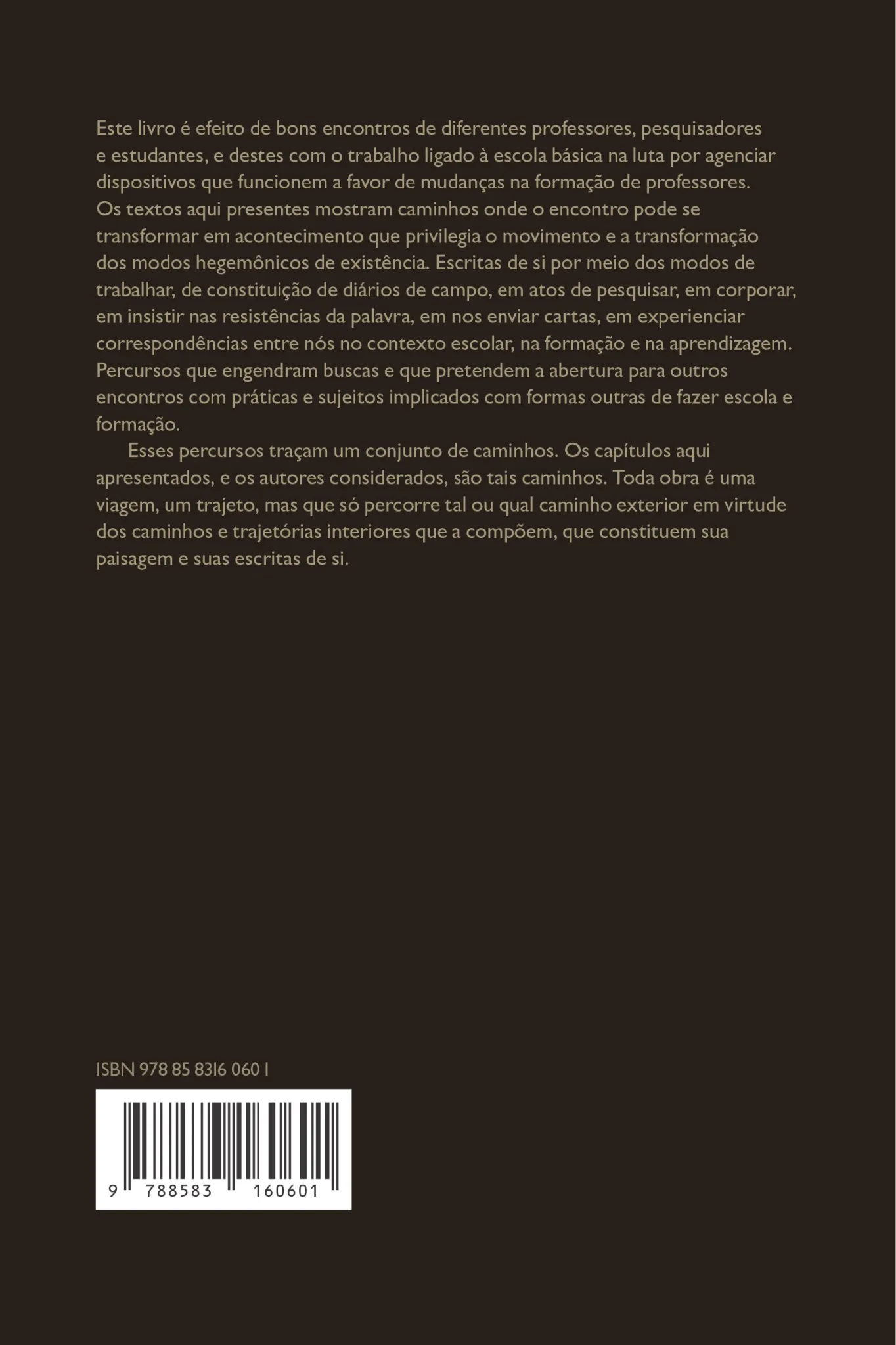 Este livro é efeito de bons encontros de diferentes professores, pesquisadores e estudantes, e destes com o trabalho ligado à escola básica na luta por agenciar dispositivos que funcionem a favor de mudanças na formação de professores. Os textos aqui presentes mostram caminhos onde o encontro pode se transformar em acontecimento que privilegia o movimento e a transformação dos modos hegemônicos de existência. Escritas de si por meio dos modos de trabalhar, de constituição de diários de campo, em atos de pesquisar, em corporar, em insistir nas resistências da palavra, em nos enviar cartas, em experienciar correspondências entre nós no contexto escolar, na formação e na aprendizagem. Percursos que engendram buscas e que pretendem a abertura para outros encontros com práticas e sujeitos implicados com formas outras de fazer escola e formação.