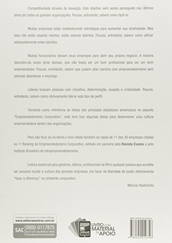 Competitividade através da inovação. Este objetivo vem sendo perseguido nos últimos anos por todas as grandes organizações. Poucas, entretanto, sabem como fazê-lo. Muitas empresas estão estabelecendo estratégias para aumentar sua atratividade. Mas elas não estão visando clientes, estão visando talentos. Poucas, entretanto, sabem como utilizar adequadamente estes talentos. Muitos funcionários deixam seus empregos para abrir seu próprio negócio. A maioria descobre, às vezes tarde demais, que não basta ser um bom profissional para ser um bom empreendedor. Poucos, entretanto, sabem que podem aliar carreira com empreendedorismo sem precisar abandonar o emprego. Líderes buscam pessoas com iniciativa, determinação, ousadia e criatividade. Poucos, entretanto, sabem como efetivamente liderar este tipo de perfil. Tomando como referência as ideias dos principais estudiosos americanos no assunto Empreendedorismo Corporativo, este livro traz algumas ideias para desenvolver uma cultura empreendedora dentro das organizações. Para não ficar só na teoria, o livro relata também 14 casos de intraempreendedorismo, sendo que 11 delas foram citadas no 1º Ranking de Empreendedorismo Corporativo, editado em parceria pela Revista Exame e pelo Instituto Brasileiro de Intraempreendedorismo. Leitura essencial para gestores, líderes, profissionais de RH e qualquer pessoa que acredite ser possível mudar a cultura das grandes empresas, em favor da liberdade de poder efetivamente fazer a diferença no ambiente corporativo.