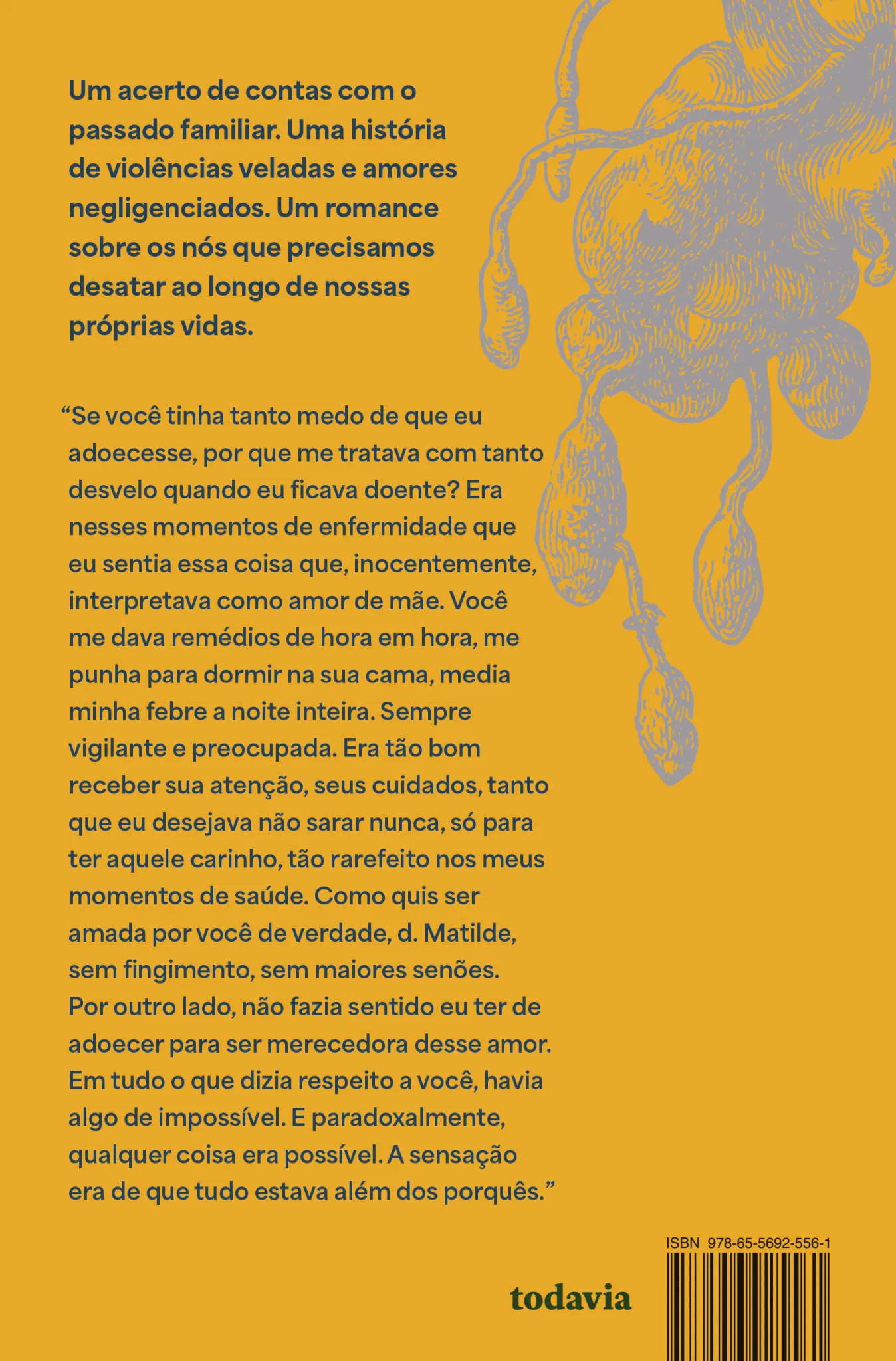 Neste romance tocante e poderoso, Maria Esther Maciel parte das “coisas” — plantas, objetos, insetos — para reconstruir o passado da protagonista. A mãe, centro das rememorações, foi uma mulher a um só tempo vítima de seu tempo e algoz da própria filha. Uma mulher que alardeava a própria infelicidade e que parecia não desejar a satisfação alheia — especialmente da filha, por quem nutria uma obsessão feita de reproches, cobranças, destruição da autoestima e desejos obscuros.