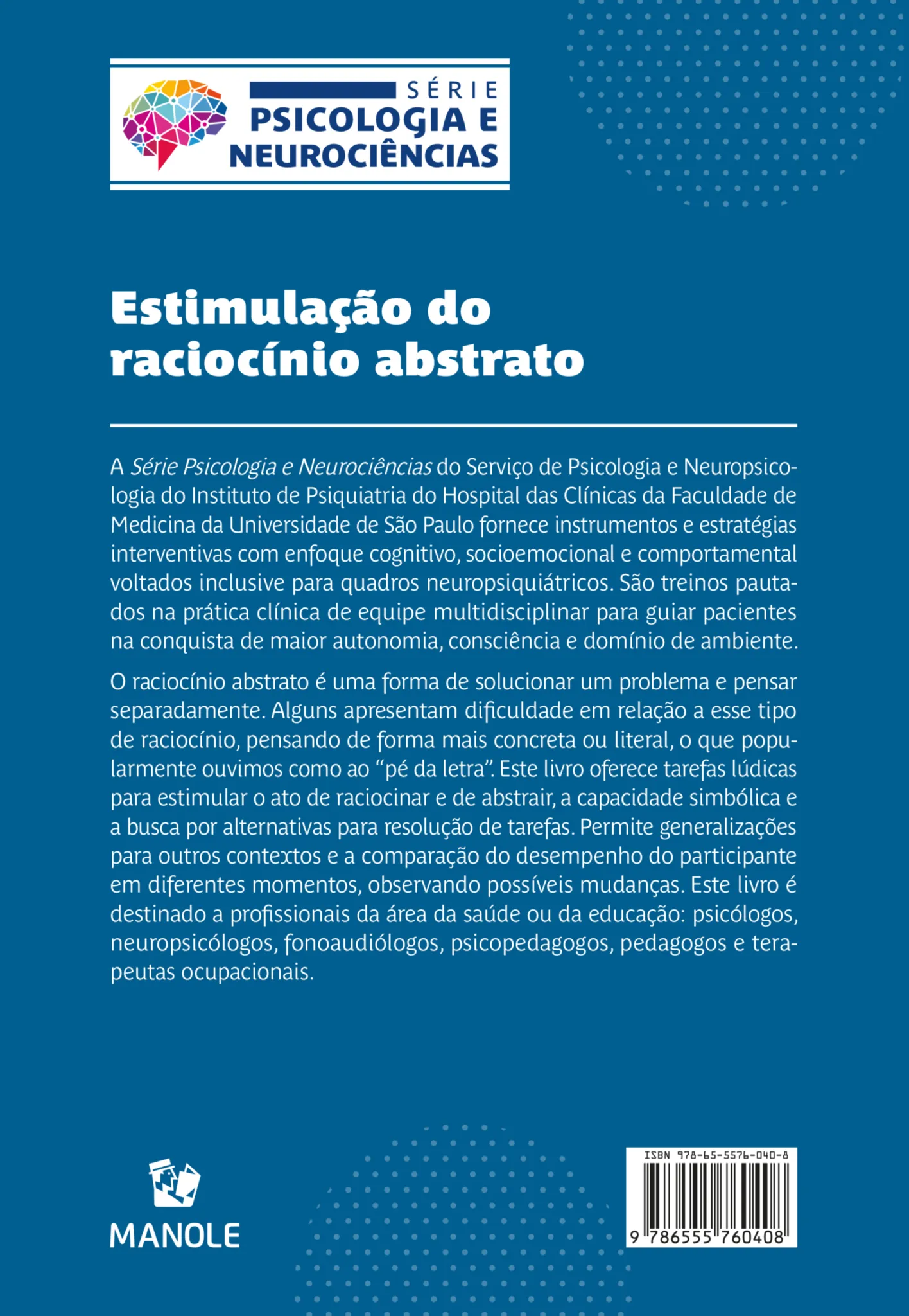 O raciocínio abstrato é uma forma de solucionar um problema e pensar separadamente. Alguns apresentam dificuldade em relação a esse tipo de raciocínio, pensando de forma mais concreta ou literal, o que popularmente ouvimos como ao “pé da letra”. Este livro oferece tarefas lúdicas para estimular o ato de raciocinar e de abstrair, a capacidade simbólica e a busca por alternativas para resolução de tarefas.