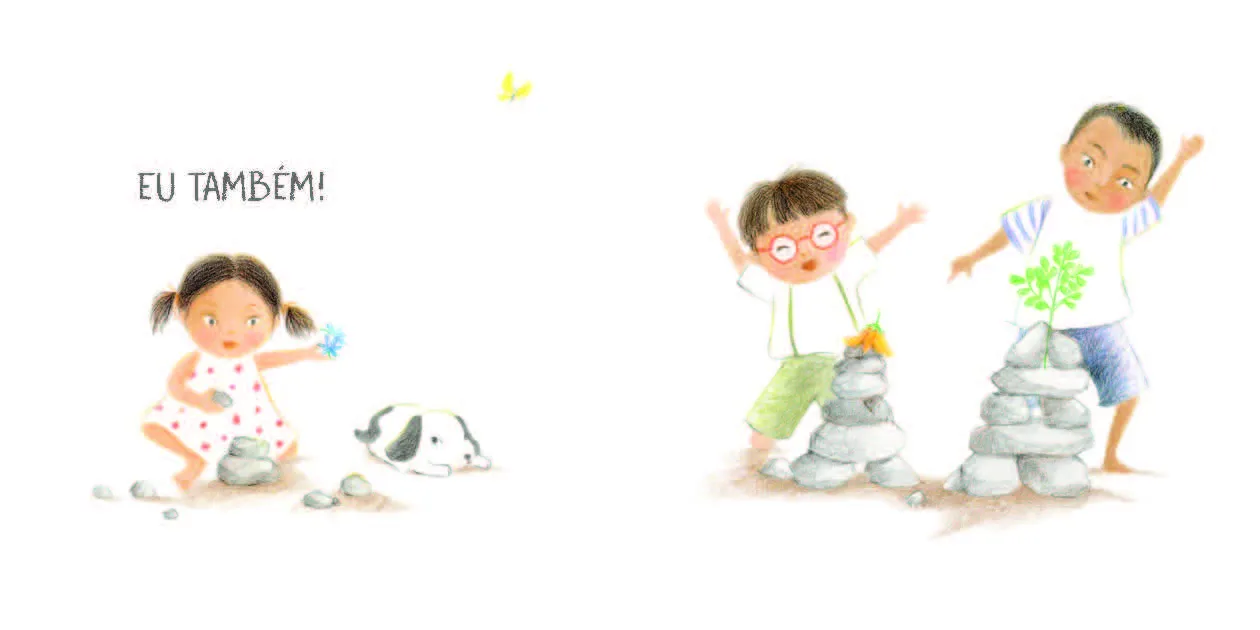 Em seu livro de estreia para os bebês, a premiada autora Lúcia Hiratsuka traz a história de três crianças em um dia na natureza: um menino maior, um médio e uma menina pequena. Numa brincadeira para ver quem chega primeiro, a narrativa traz uma relação com o tempo, com o brincar, o apreciar e as relações de afeto. Um livro para ler em família.