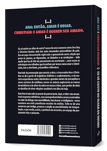 Amor, existência e uma conversa franca entre dois dos mais renomados psicanalistas do país! Eu só existo no olhar do outro? nasce de uma conversa entre Ana Suy e Christian Dunker, dois dos mais renomados psicanalistas do país. Em um papo descontraído registrado e apresentado nesta edição que preza as pausas, as digressões, os titubeios e as revelações – tudo aquilo que faz da fala um pensamento em movimento –, suas vozes se entrelaçam em reflexões que transitam por temas como amor e identidade, luto e alteridade, psicanálise e literatura. Partindo da provocação que nomeia a obra, a troca entre Ana e Christian se dá a partir de trajetórias distintas e suplementares, e de maneira espontânea: entre referências a grandes nomes da psicanálise e cenas curiosas do cotidiano, vemos os autores explorarem as tramas da existência e do olhar do outro em nossas vidas, sem perder de vista os desafios de viver relações saudáveis nos dias de hoje. Este livro é uma ode ao prazer de pensar junto. Aqui, o leitor não encontrará respostas definitivas, mas acompanhará ideias serem construídas no calor do diálogo com sensibilidade, bom humor e inteligência – como acontece nas mais proveitosas sessões de análise. Trata-se de uma conversa que instiga, provoca e amplia as possibilidades de interpretação, e que revela, assim, a potência do encontro, um espaço de pensamento vivo e pulsante.