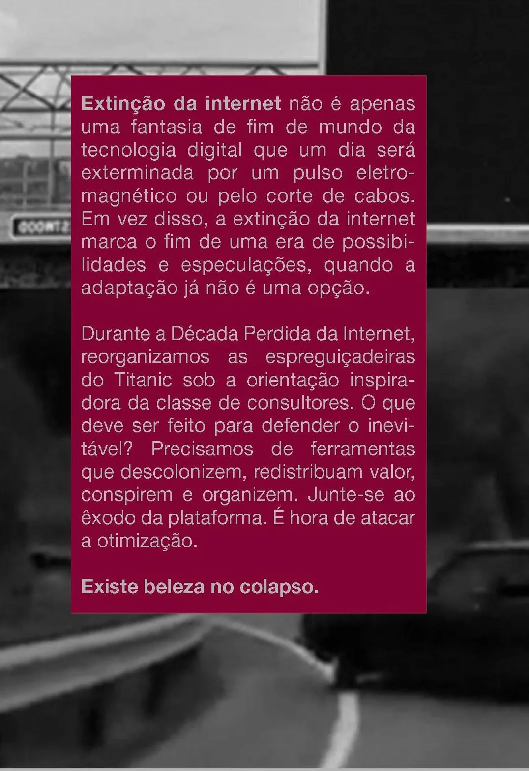 Durante a Década Perdida da Internet, reorganizamos as espreguiçadeiras do Titanic sob a orientação inspiradora da classe de consultores. O que deve ser feito para defender o inevitável? Precisamos de ferramentas que descolonizem, redistribuam valor, conspirem e organizem. Junte-se ao êxodo da plataforma. É hora de atacar a otimização.