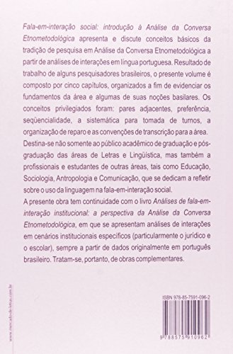 Esta obra apresenta e discute conceitos básicos da tradição de pesquisa em Análise da Conversa Etnometodológica a partir de análises de interações em língua portuguesa. Resultado de trabalho de alguns pesquisadores brasileiros, o presente volume é composto por cinco capítulos, organizados a fim de evidenciar os fundamentos da área e algumas de suas noções basilares. Os conceitos privilegiados foram: pares adjacentes, preferência, seqüencialidade, a sistemática para tomada de turnos, a organização de reparo e as convenções de transcrição para a área.