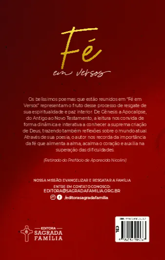 Os belíssimos poemas que estão reunidos em “Fé em Versos” representam o fruto desse processo de resgate da espiritualidade e paz interior do autor. De Gênesis a Apocalipse, do Antigo ao Novo Testamento, a leitura nos convida de forma dinâmica e interativa a conhecer a suprema criação de Deus, trazendo também reflexões sobre o mundo atual. Através de sua poesia, o autor nos recorda da importância da fé que alimenta a alma, acalma o coração e auxilia na superação das dificuldades. Desejo que essa leitura traga paz a muitos corações. Que você tenha oportunidade de expandir os limites de sua fé, amor, esperança e paz interior através destes versos.