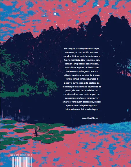 Ela chega e traz alegria na estampa, nas cores, no sorriso. Ela vem e se espalha. Felícia, nesta história, vem e fica na memória. Sim, tem rima, sim, senhor. Tem poesia e sonoridades. Junto disso, a gente se abisma com tantas cores, paisagens, campo e cidade, esquina e sombra de árvore, favela, sertão e mansão. Quase é possível ouvir o rangido gostoso da bicicleta pelos caminhos, sejam eles de pedra, de areia ou de asfalto. Um convite a olhar para o alto, espiar um céu sempre mutante, ver azul, ver amarelo, ver nuvem passageira, chegar e partir com a alegria na garupa. Leitura de ninar, leitura de alegrar. Ana Elisa Ribeiro