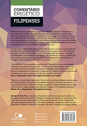 Neste formidável comentário, o respeitado estudioso do Novo Testamento e autor best-seller Gordon Fee apresenta um estudo acadêmico, e ainda assim de leitura acessível. Ele trabalha com base no texto grego e é cirúrgico ao situar a Carta de Paulo aos Filipenses no contexto de amizade e de exortação moral no primeiro século para uma igreja que enfrenta oposição por causa da lealdade a Jesus Cristo. O autor consegue, ao mesmo tempo, dedicar atenção proporcional e adequada à relevância teológica e espiritual da carta.