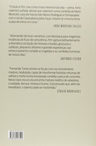 Romance de estreia de Fernanda Torres traz grupo de amigos cariocas às voltas com a morte e as próprias frustrações. Livro adaptado para a série “Fim”, lançada em 2023 no Globoplay. Cinco amigos cariocas rememoram as passagens marcantes de suas vidas: festas, casamentos, separações, manias, inibições, arrependimentos. Álvaro vive sozinho, passa o tempo de médico em médico e não suporta a ex-mulher. Sílvio é um junkie que não larga os excessos de droga e sexo nem na velhice. Ribeiro é um rato de praia atlético que ganhou sobrevida sexual com o Viagra. Neto é o careta da turma, marido fiel até os últimos dias. E Ciro, o Don Juan invejado por todos – mas o primeiro a morrer, abatido por um câncer. São figuras muito diferentes, mas que partilham não apenas o fato de estar no extremo da vida, como também a limitação de horizontes. Sucesso na carreira, realização pessoal e serenidade estão fora de questão – ninguém parece ser capaz de colher, no fim das contas, mais do que um inventário de frustrações. Ao redor deles pairam mulheres neuróticas, amargas, sedutoras, desencanadas, descartadas, conformadas. Paira também um padre em crise com a própria vocação e um séquito de tipos cariocas frutos da arguta capacidade de observação da autora. Há graça, sexo, sol e praia nas páginas de Fim. Mas elas também são cheias de resignação e cobertas por uma tinta de melancolia. Humor sem superficialidade, lirismo sem cafonice, complexidade sem afetação, densidade sem chatice: de que mais precisa um romance para dizer a que veio?