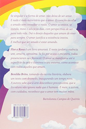 Flor e Rosa é um livro amoroso. E neste jardim a essência une, amarra, aproxima. Se foi por acaso o encontro, todos presenciaram seu florescer. O amor se manifestou até à superficie da pele e iluminou o seu entorno, como acontece com todos aqueles que amam. Benilda Brito, tomando da escrita literária, elabora um texto com desmedo, inaugurando um tempo novo. A autora sabe que a arte desconhece preconceitos, que a literatura não ignora nada que é humano. E mais, a autora, com cuidados, reconhece que o amor tem muitas mãos. (Bartolomeu Campos de Queirós)