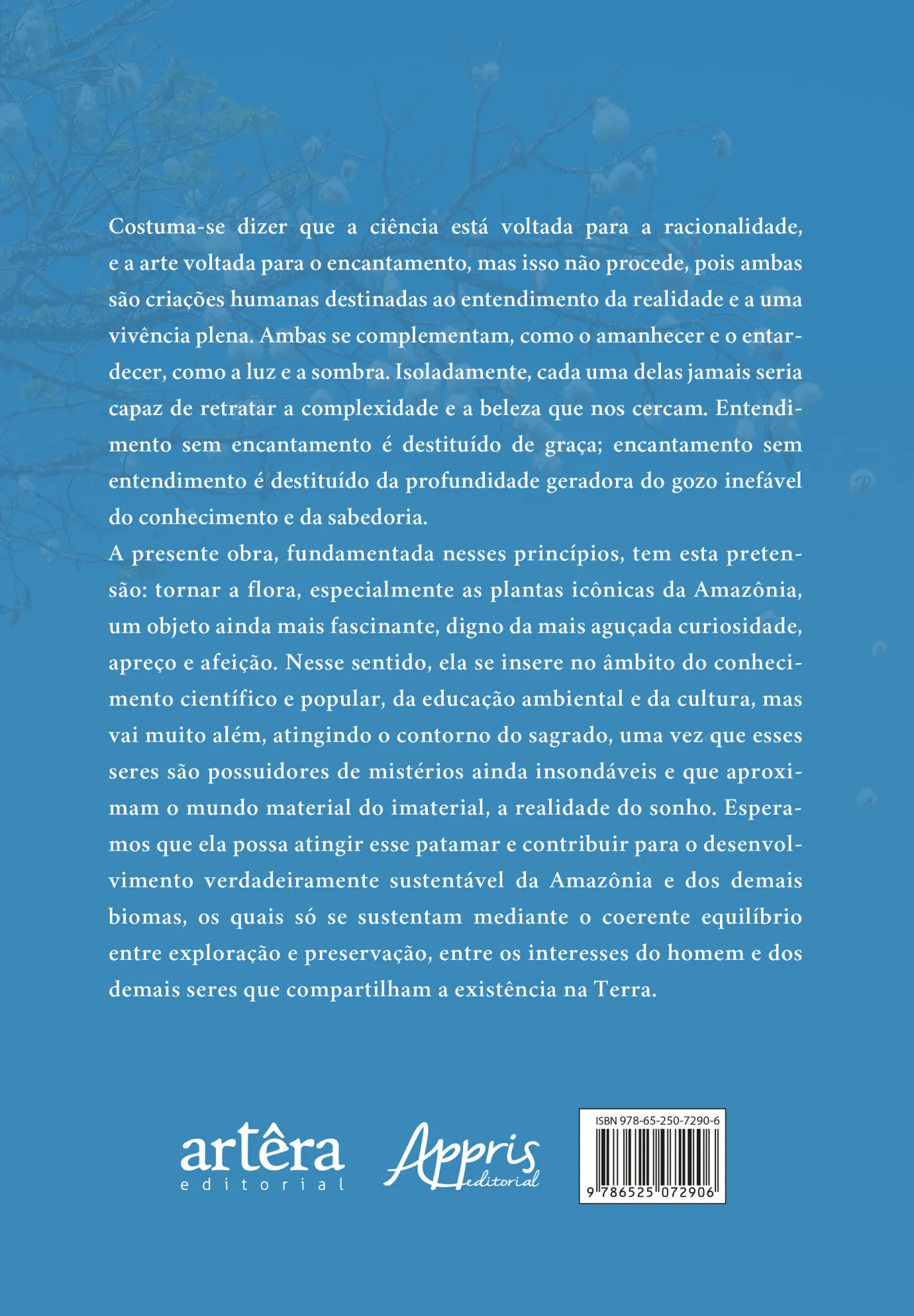 A presente obra, fundamentada nesses princípios, tem esta pretensão: tornar a flora, especialmente as plantas icônicas da Amazônia, um objeto ainda mais fascinante, digno da mais aguçada curiosidade, apreço e afeição. Nesse sentido, ela se insere no âmbito do conhecimento científico e popular, da educação ambiental e da cultura, mas vai muito além, atingindo o contorno do sagrado, uma vez que esses seres são possuidores de mistérios ainda insondáveis e que aproximam o mundo material do imaterial, a realidade do sonho. Esperamos que ela possa atingir esse patamar e contribuir para o desenvolvimento verdadeiramente sustentável da Amazônia e dos demais biomas, os quais só se sustentam mediante o coerente equilíbrio entre exploração e preservação, entre os interesses do homem e dos demais seres que compartilham a existência na Terra.