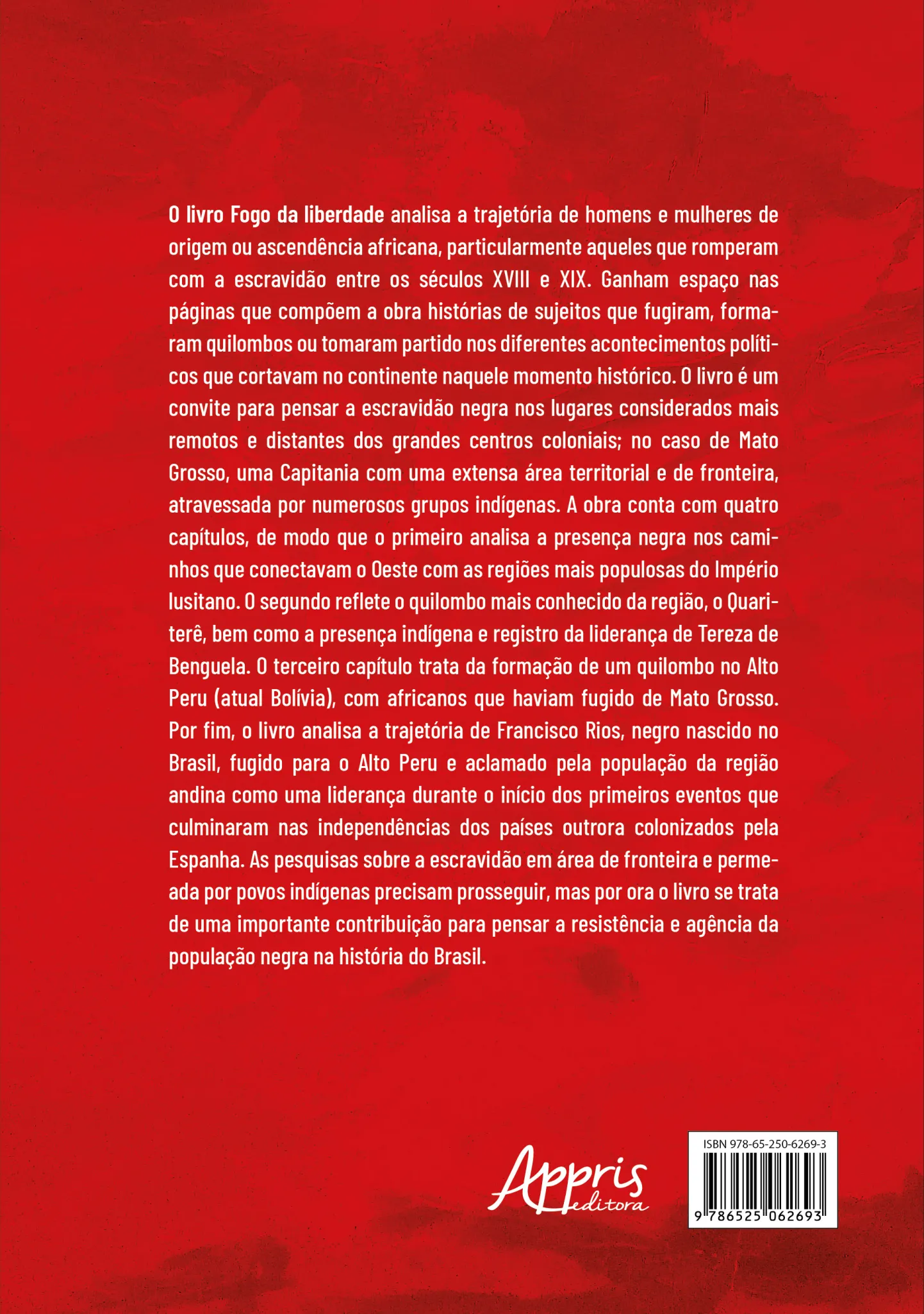 O livro Fogo da liberdade analisa a trajetória de homens e mulheres de origem ou ascendência africana, particularmente aqueles que romperam com a escravidão entre os séculos XVIII e XIX. Ganham espaço nas páginas que compõem a obra histórias de sujeitos que fugiram, formaram quilombos ou tomaram partido nos diferentes acontecimentos políticos que cortavam no continente naquele momento histórico. O livro é um convite para pensar a escravidão negra nos lugares considerados mais remotos e distantes dos grandes centros coloniais; no caso de Mato Grosso, uma Capitania com uma extensa área territorial e de fronteira, atravessada por numerosos grupos indígenas. A obra conta com quatro capítulos, de modo que o primeiro analisa a presença negra nos caminhos que conectavam o Oeste com as regiões mais populosas do Império lusitano. O segundo reflete o quilombo mais conhecido da região, o Quariterê, bem como a presença indígena e registro da liderança de Tereza de Benguela. O terceiro capítulo trata da formação de um quilombo no Alto Peru (atual Bolívia), com africanos que haviam fugido de Mato Grosso. Por fim, o livro analisa a trajetória de Francisco Rios, negro nascido no Brasil, fugido para o Alto Peru e aclamado pela população da região andina como uma liderança durante o início dos primeiros eventos que culminaram nas independências dos países outrora colonizados pela Espanha. As pesquisas sobre a escravidão em área de fronteira e permeada por povos indígenas precisam prosseguir, mas por ora o livro se trata de uma importante contribuição para pensar a resistência e agência da população negra na história do Brasil.