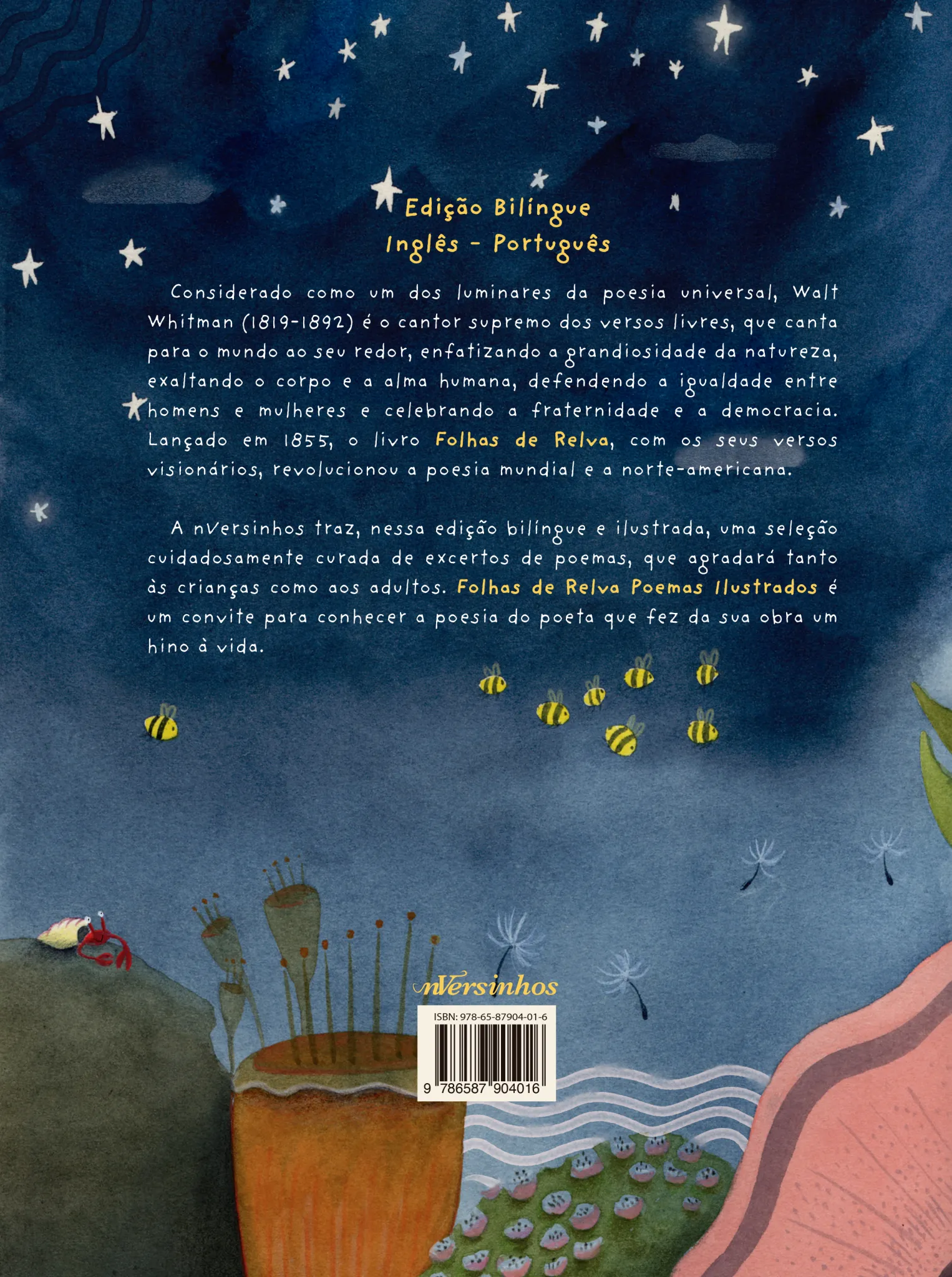 A nVersinho traz, nessa edição bilíngue e ilustrada, uma seleção de excertos de poemas do escritor Walt Whitman. Os poemas combinam temas que refletem a vastidão do universo, o milagre da vida e a consciência da igualdade entre as pessoas. FOLHAS DE RELVA POEMAS ILUSTRADOS é voltado tanto para as crianças, que terão a oportunidade de conhecer a poesia de Whitman, quanto para o público adulto que se sentirá abraçado pelos versos.