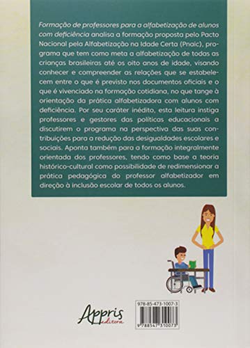 formação de professores para a alfabetização de alunos com deficiência analisa a formação proposta pelo Pacto Nacional pela Alfabetização na Idade Certa (Pnaic), programa que tem como meta a alfabetização de todas as crianças brasileiras até os oito anos de idade, visando conhecer e compreender as relações que se estabelecem entre o que é previsto nos documentos oficiais e o que é vivenciado na formação cotidiana, no que tange à orientação da prática alfabetizadora com alunos com deficiência. Por seu caráter inédito, esta leitura instiga professores e gestores das educacionais a discutirem o programa na perspectiva das suas contribuições para a redução das desigualdades escolares e sociais. Aponta também para a formação integralmente orientada dos professores, tendo como base a teoria histórico-cultural como possibilidade de redimensionar a prática pedagógica do professor alfabetizador em direção à inclusão escolar de todos os alunos.