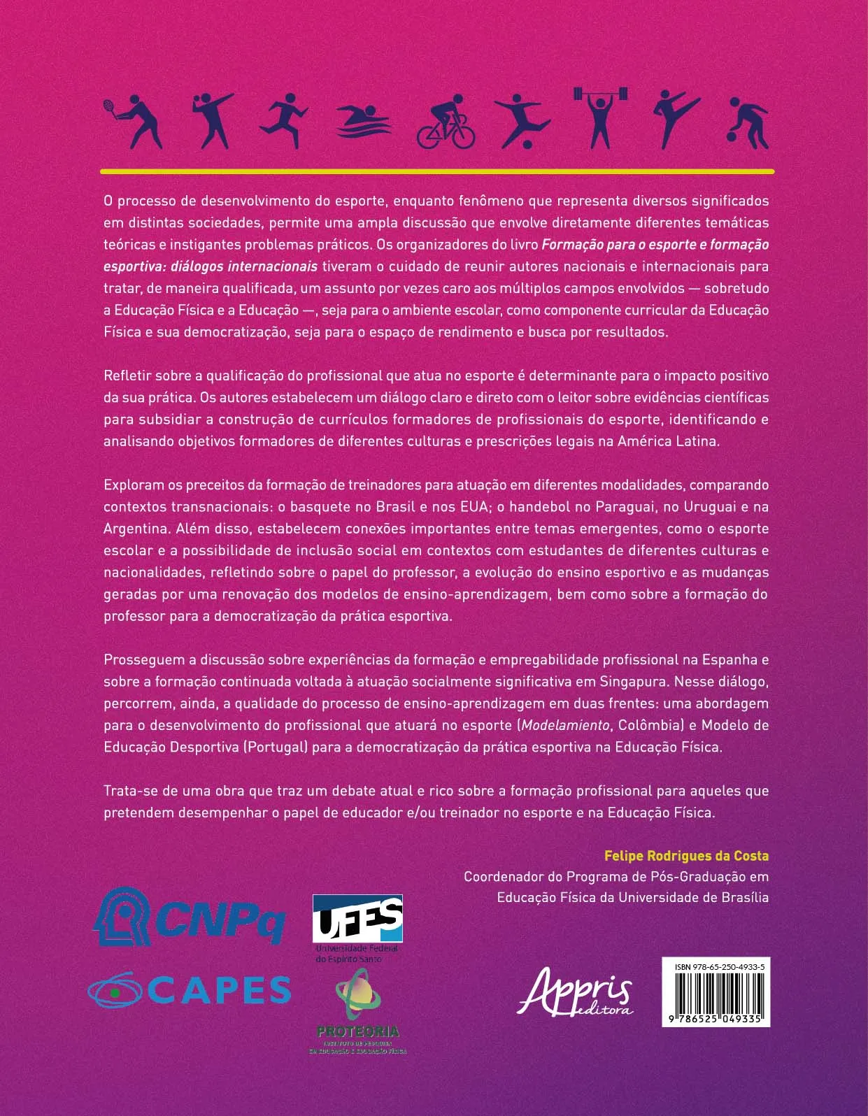 O processo de desenvolvimento do esporte, enquanto fenômeno que representa diversos significados em distintas sociedades, permite uma ampla discussão que envolve diretamente diferentes temáticas teóricas e instigantes problemas práticos. Os organizadores do livro Formação para o esporte e formação esportiva: diálogos internacionais tiveram o cuidado de reunir autores nacionais e internacionais para tratar, de maneira qualificada, um assunto por vezes caro aos múltiplos campos envolvidos — sobretudo a Educação Física e a Educação —, seja para o ambiente escolar, como componente curricular da Educação Física e sua democratização, seja para o espaço de rendimento e busca por resultados. Refletir sobre a qualificação do profissional que atua no esporte é determinante para o impacto positivo da sua prática. Os autores estabelecem um diálogo claro e direto com o leitor sobre evidências científicas para subsidiar a construção de currículos formadores de profissionais do esporte, identificando e analisando objetivos formadores de diferentes culturas e prescrições legais na América Latina. Exploram os preceitos da formação de treinadores para atuação em diferentes modalidades, comparando contextos transnacionais: o basquete no Brasil e nos EUA; o handebol no Paraguai, no Uruguai e na Argentina. Além disso, estabelecem conexões importantes entre temas emergentes, como o esporte escolar e a possibilidade de inclusão social em contextos com estudantes de diferentes culturas e nacionalidades, refletindo sobre o papel do professor, a evolução do ensino esportivo e as mudanças geradas por uma renovação dos modelos de ensino-aprendizagem, bem como sobre a formação do professor para a democratização da prática esportiva. Prosseguem a discussão sobre experiências da formação e empregabilidade profissional na Espanha e sobre a formação continuada voltada à atuação socialmente significativa em Singapura. Nesse diálogo, percorrem, ainda, a qualidade do processo de ensino-aprendizagem em duas frentes: uma abordagem para o desenvolvimento do profissional que atuará no esporte (Modelamiento, Colômbia) e Modelo de Educação Desportiva (Portugal) para a democratização da prática esportiva na Educação Física. Trata-se de uma obra que traz um debate atual e rico sobre a formação profissional para aqueles que pretendem desempenhar o papel de educador e/ou treinador no esporte e na Educação Física. Felipe Rodrigues da Costa Coordenador do Programa de Pós-Graduação em Educação Física da Universidade de Brasília