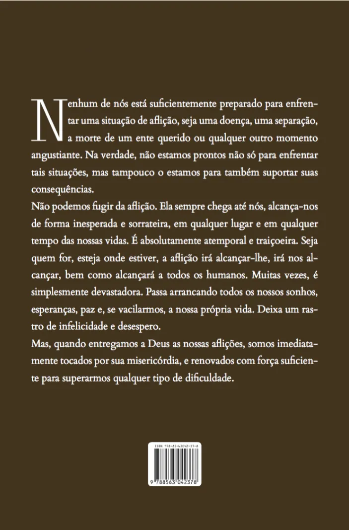 “Nenhum de nós está suficientemente preparado para enfren- tar uma situação de aflição, seja uma doença, uma separação, a morte de um ente querido ou qualquer outro momento angustiante. Na verdade, não estamos prontos não só para enfrentar tais situações, mas tampouco o estamos para também suportar suas consequências. Não podemos fugir da aflição. Ela sempre chega até nós, alcança-nos de forma inesperada e sorrateira, em qualquer lugar e em qualquer tempo das nossas vidas. É absolutamente atemporal e traiçoeira. Seja quem for, esteja onde estiver, a aflição irá alcançar-lhe, irá nos al- cançar, bem como alcançará a todos os humanos. Muitas vezes, é simplesmente devastadora. Passa arrancando todos os nossos sonhos, esperanças, paz e, se vacilarmos, a nossa própria vida. Deixa um ras- tro de infelicidade e desespero. Mas, quando entregamos a Deus as nossas aflições, somos imediata- mente tocados por sua misericórdia, e renovados com força suficien- te para superarmos qualquer tipo de dificuldade.”