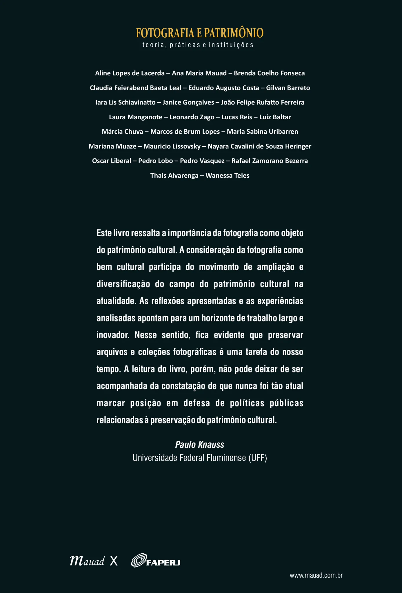 Reunindo especialistas de campos diversificados, as contribuições deste livro enfrentam questões teóricas, historiográficas, debates sobre as instituições de patrimônio no Brasil, Argentina e Chile, os usos e as práticas de material fotográfico, bem como as formas de mobilização dos acervos, objetos e séries fotográficas. Esta obra se propõe a constituir um corpus capaz de estruturar não apenas temas importantes para a reflexão, mas, em especial, perspectivas de debate e estratégias de mobilização prática de pesquisa e gestão institucional, com a intenção de contribuir com instituições patrimoniais públicas e privadas, bem como faculdades e centros de pesquisa dedicados ao patrimônio cultural. O território nacional brasileiro, nas relações com países da América do Sul, é a sua escala, o que define também o seu público. Tem, como perspectiva, o estabelecimento de um referencial para o campo do patrimônio, no debate que envolve a cultura material, a cultura visual, o patrimônio e a fotografia. Numa abordagem inovadora, o livro conta ainda com cinco ensaios fotográficos, com o desafio de abrir um canal importante de comunicação entre o debate acadêmico e a prática fotográfica, entendendo que esta relação traz contribuições importantes para pensarmos os processos envolvendo patrimônio e fotografia.
