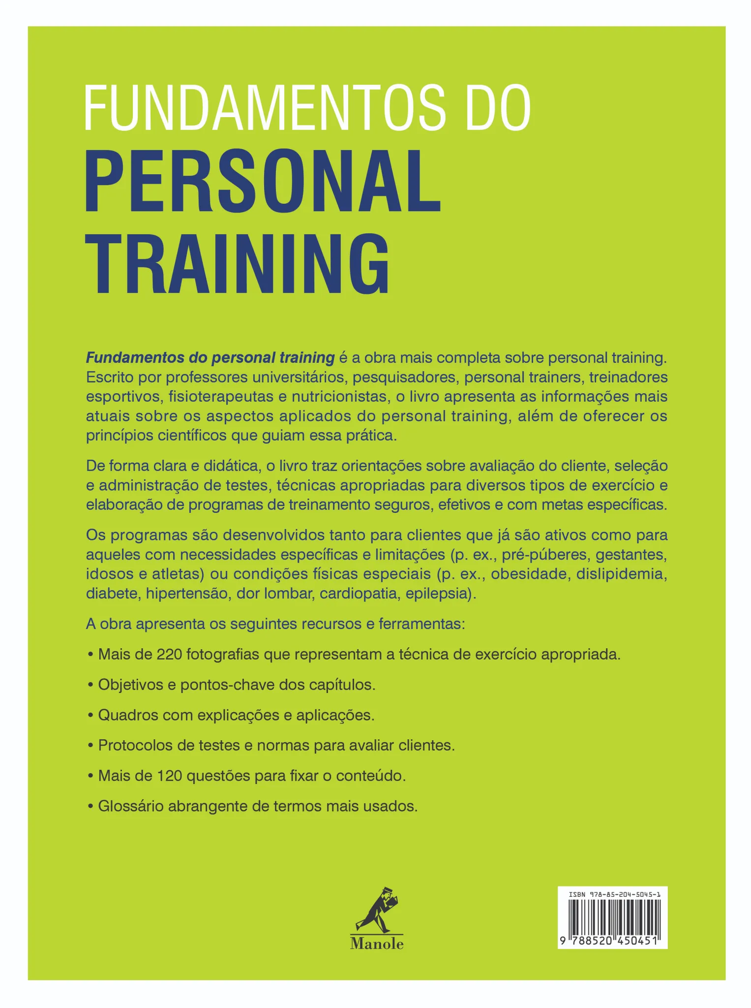 De forma clara e didática, o livro traz orientações sobre avaliação do cliente, seleção e administração de testes, técnicas apropriadas para diversos tipos de exercício e elaboração de programas de treinamento seguros, efetivos e com metas específicas.