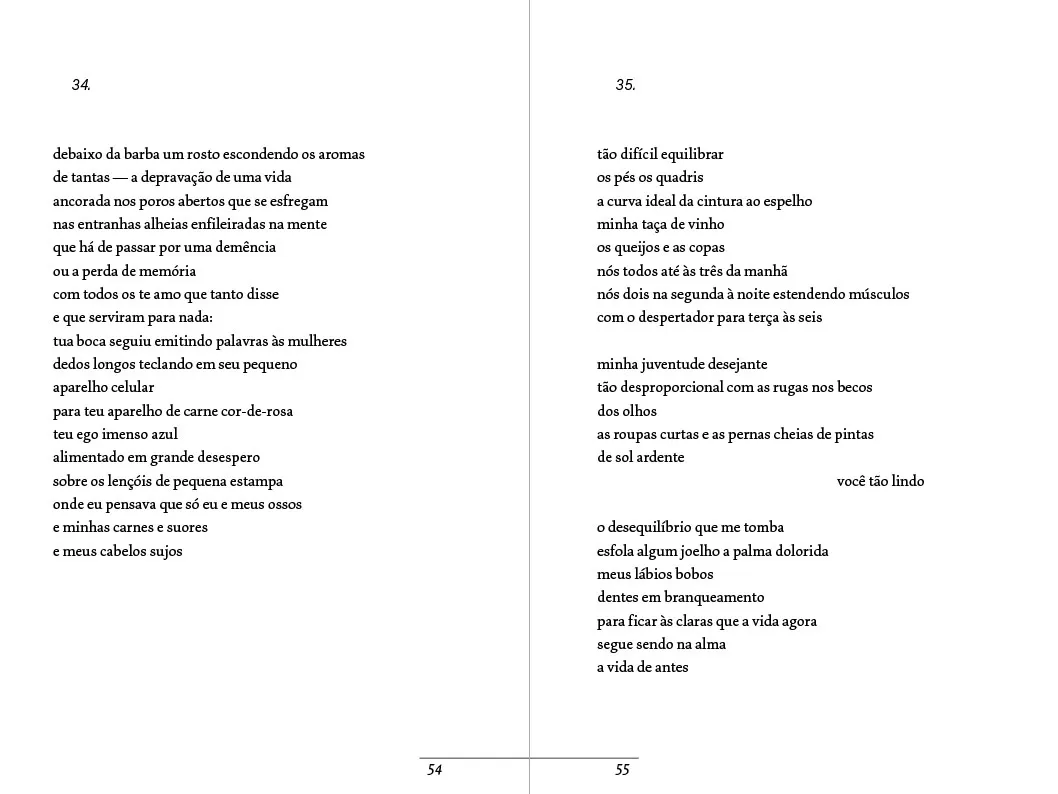 A vida e a morte, o gozo e ausência de prazer também surgem pelos versos que estão distribuídos nestes 51 poemas “translúcidos” que “atraem como uma aurora boreal”, segundo Martha Medeiros na 4ª capa da edição. Texto de orelha de Pedro Gonzaga e imagem de capa da artista Letícia Lopes.