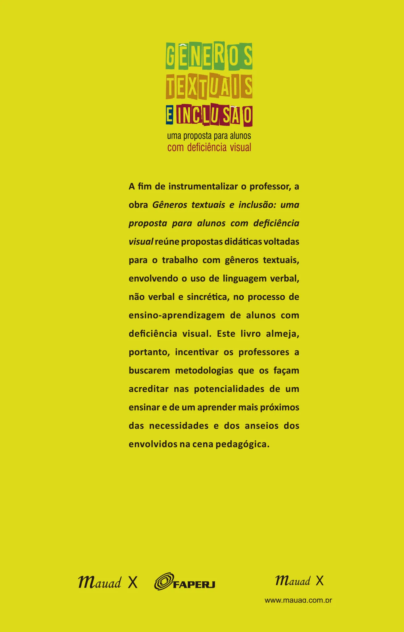 Em se tratando do ensino de Língua Portuguesa, é preciso ampliar as experiências com práticas de linguagens, trabalhando-se com a diversidade de gêneros textuais que circulam socialmente, eliminando-se as barreiras comunicacionais no que tange à pessoa com deficiência visual. Nesse sentido, este livro se propõe a compartilhar saberes e práticas docentes constituídos a partir da pesquisa e de vivências no ensino para estudantes cegos e com baixa visão no âmbito da leitura e produção textual.
