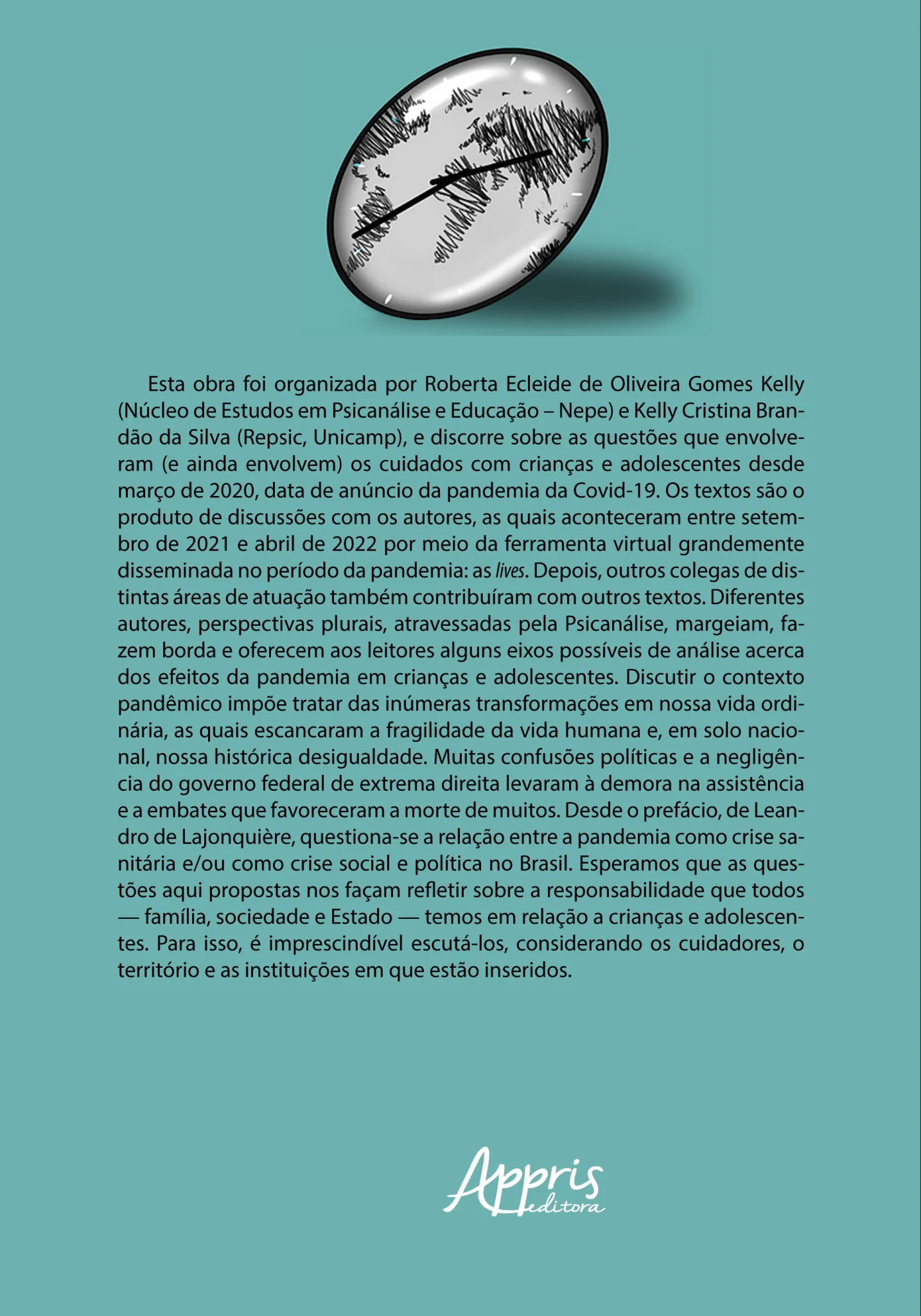 Esta obra foi organizada por Roberta Ecleide de Oliveira Gomes Kelly(Núcleo de Estudos em Psicanálise e Educação – Nepe) e Kelly Cristina Brandão da Silva (Repsic, Unicamp), e discorre sobre as questões que envolveram (e ainda envolvem) os cuidados com crianças e adolescentes desde março de 2020, data de anúncio da pandemia da Covid-19. Os textos são o produto de discussões com os autores, as quais aconteceram entre setembro de 2021 e abril de 2022 por meio da ferramenta virtual grandemente disseminada no período da pandemia: as lives. Depois, outros colegas de distintas áreas de atuação também contribuíram com outros textos. Diferentes autores, perspectivas plurais, atravessadas pela Psicanálise, margeiam, fazem borda e oferecem aos leitores alguns eixos possíveis de análise acerca dos efeitos da pandemia em crianças e adolescentes. Discutir o contexto pandêmico impõe tratar das inúmeras transformações em nossa vida ordinária, as quais escancaram a fragilidade da vida humana e, em solo nacional, nossa histórica desigualdade. Muitas confusões políticas e a negligência do governo federal de extrema direita levaram à demora na assistência e a embates que favoreceram a morte de muitos. Desde o prefácio, de Leandro de Lajonquière, questiona-se a relação entre a pandemia como crise sanitária e/ou como crise social e política no Brasil. Esperamos que as questões aqui propostas nos façam re‑etir sobre a responsabilidade que todos — família, sociedade e Estado — temos em relação a crianças e adolescentes. Para isso, é imprescindível escutá-los, considerando os cuidadores, o território e as instituições em que estão inseridos.