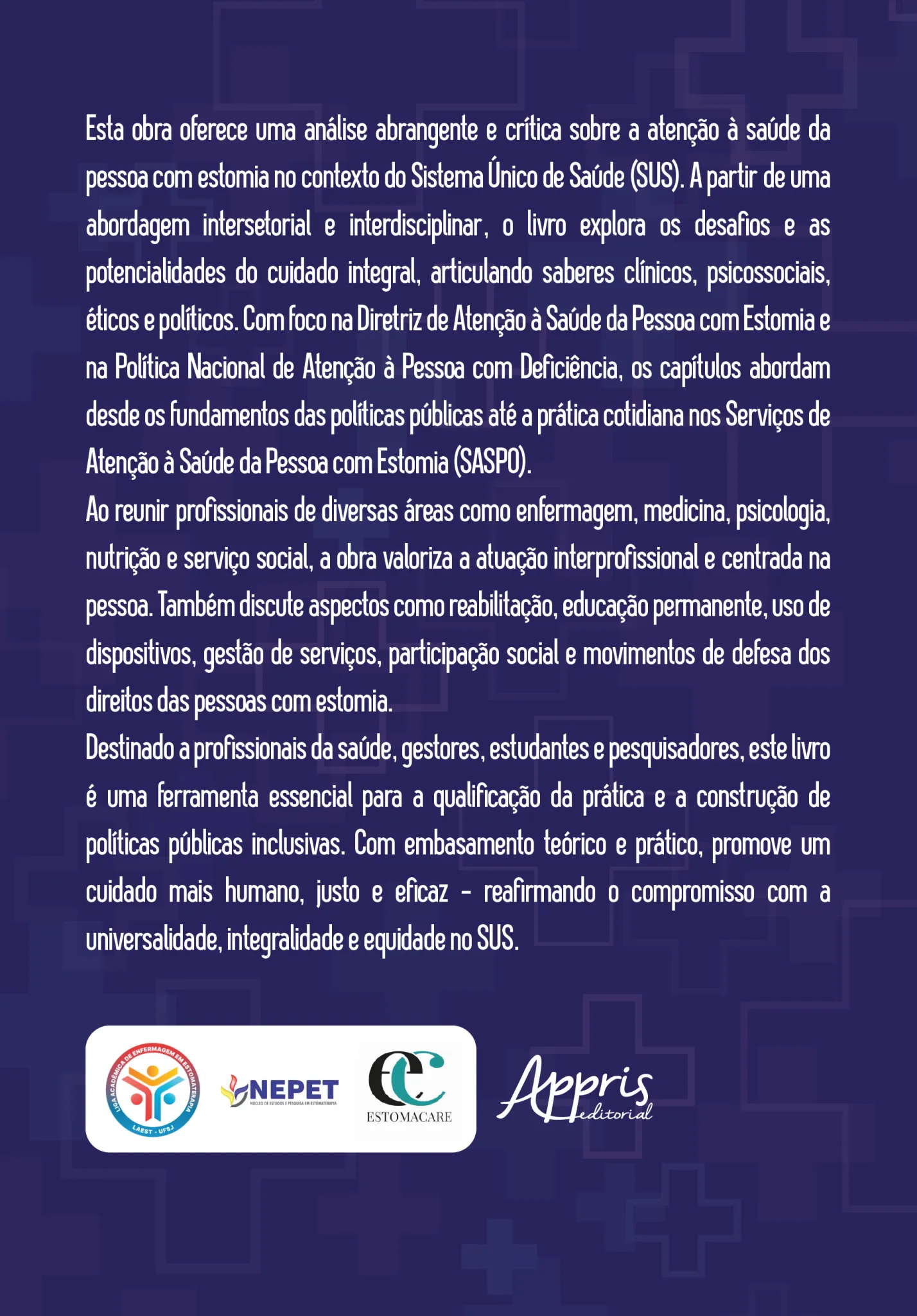 Esta obra oferece uma análise abrangente e crítica sobre a atenção à saúde da pessoa com estomia no contexto do Sistema Único de Saúde (SUS). A partir de uma abordagem intersetorial e interdisciplinar, o livro explora os desafios e as potencialidades do cuidado integral, articulando saberes clínicos, psicossociais, éticos e políticos. Com foco na Diretriz de Atenção à Saúde da Pessoa com Estomia e na Política Nacional de Atenção à Pessoa com Deficiência, os capítulos abordam desde os fundamentos das políticas públicas até a prática cotidiana nos Serviços de Atenção à Saúde da Pessoa com Estomia (SASPO).