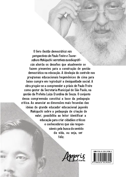 O livro Gestão democrática nas perspectivas de Paulo Freire e Tsunesaburo Makiguchi: narrativas autobiográficas aborda os desafios que atualmente se fazem presentes para a construção de gestão democrática na educação. A ideologia do controle nos programas educacionais hegemônicos de cima para baixo cumpre em reproduzir a desigualdade social. A obra propõe-se a compreender a práxis de Paulo Freire como gestor da Secretaria Municipal de São Paulo, na gestão da Prefeita Luiza Erundina de Souza. O conjunto dessa compreensão constitui a base da pedagogia crítica. Ao anunciar as dimensões mais fecundas das ideias do grande educador educacional japonês Makiguchi sobre a pedagogia de criação de valor, possibilita ao leitor identificar a educação para criar cidadãos críticos e conhecedores que são responsáveis pela busca do sentido da vida, ou seja, ser feliz.