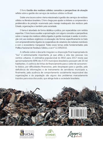 O livro Gestão dos resíduos sólidos: conceitos e perspectivas de atuação reflete sobre a gestão dos serviços de resíduos sólidos no Brasil. Existe uma lacuna sobre o tema relacionada à gestão dos serviços de resíduos sólidos na literatura brasileira. O livro chega para ajudar os leitores a compreender a problemática da poluição ocasionada pelo manejo inadequado dos resíduos pelo Estado, organizações e também pela sociedade. O tema é abordado de forma didática e prática, por especialistas com notória expertise. O livro busca auxiliar a aproximação com alguns conceitos e perspectivas sobre o manejo dos resíduos sólidos ligados à gestão municipal, à saúde, à construção civil, aos resíduos orgânicos e à educação não formal, especificamente no trato com empreendimentos ligados às cooperativas de catadores de materiais recicláveis e com o ecossistema manguezal. Todos esses temas estão fundamentados pela Política Nacional de Resíduos Sólidos, a Lei nº 12.305/2010. A reflexão sobre o descarte irregular e a disposição final inapropriada do “lixo” é extremamente importante, já que afeta a vida das pessoas nos centros urbanos. A estimativa populacional do IBGE para 2017 revela que aproximadamente 68% dos 5.570 municípios brasileiros possuem até 20 mil habitantes. A carência de linhas de financiamento para o setor de saneamento básico, por dificuldades financeiras, pelo despreparo para a gestão, pela deficiência de informações e de treinamento de servidores municipais e, finalmente, pela ausência de comportamento socialmente responsável das organizações e da população são alguns dos problemas marcadamente trazidos para essa discussão, que atinge toda a sociedade brasileira.