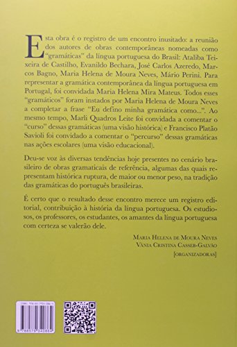 Esta obra é o registro de um encontro inusitado: a reunião dos autores de obras contemporâneas nomeadas como “gramáticas” da língua portuguesa do Brasil: Ataliba Teixeira de Castilho, Evanildo Bechara, José Carlos Azeredo, Marcos Bagno, Maria Helena de Moura Neves, Mário Perini. Para representar a gramática contemporânea da língua portuguesa em Portugal, foi convidada Maria Helena Mira Mateus. Todos esses “gramáticos” foram instados por Maria Helena de Moura Neves a completar a frase “Eu defino minha gramática como…”. Ao mesmo tempo, Marli Quadros Leite foi convidada a comentar o “curso” dessas gramáticas (uma visão histórica) e Francisco Platão Savioli foi convidado a comentar o “percurso” dessas gramáticas nas ações escolares (uma visão educacional).Deu-se voz às diversas tendências hoje presentes no cenário brasileiro de obras gramaticais de referência, algumas das quais representam histórica ruptura, de maior ou menor peso, na tradição das gramáticas do português brasileiras.É certo que o resultado desse encontro merece um registro editorial, contribuição à história da língua portuguesa. Os estudiosos, os professores, os estudantes, os amantes da língua portuguesa com certeza se valerão dele.