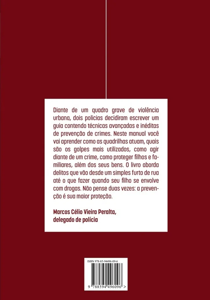 Diante de um quadro grave de violência urbana, dois policiais decidiram escrever um guia contendo técnicas avançadas e inéditas de prevenção de crimes. Neste manual você vai aprender como as quadrilhas atuam, quais são os golpes mais utilizados, como agir diante de um crime, como proteger filhos e familiares, além dos seus bens. O livro aborda delitos que vão desde de um assédio corriqueiro no trabalho até o que fazer quando seu filho se envolve com drogas. Não pense duas vezes: a prevenção é sua maior proteção.