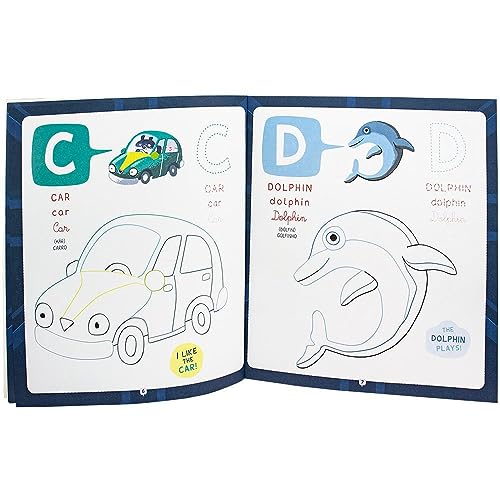Um divertido livro para aprender o alfabeto e palavras em inglês, com letras de fôrma e cursiva, escrevendo e colorindo.