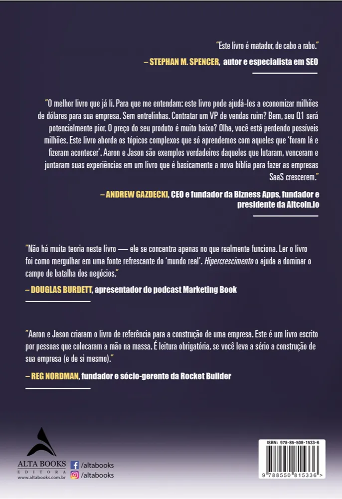 ”O melhor livro que já li. Para que me entendam: este livro pode ajudá-los a economizar milhões de dólares para sua empresa. Sem entrelinhas. Contratar um VP de vendas ruim? Bem, seu Q1 será potencialmente pior. O preço do seu produto é muito baixo? Olha, você está perdendo possíveis milhões. Este livro aborda os tópicos complexos que só aprendemos com aqueles que ‘foram lá e fizeram acontecer’. Aaron e Jason são exemplos verdadeiros daqueles que lutaram, venceram e juntaram suas experiências em um livro que é basicamente a nova bíblia para fazer as empresas SaaS crescerem.” – ANDREW GAZDECKI, CEO e fundador da Bizness Apps, fundador e presidente da Altcoin.io