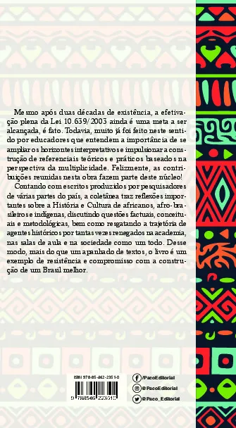 Contando com escritos produzidos por pesquisadores de várias partes do país, a coletânea traz reflexões importantes sobre a História e Cultura de africanos, afro-brasileiros e indígenas, discutindo questões factuais, conceituais e metodológicas, bem como resgatando a trajetória de agentes históricos por tantas vezes renegados na academia, nas salas de aula e na sociedade como um todo. Desse modo, mais do que um apanhado de textos, o livro é um exemplo de resistência e compromisso com a construção de um Brasil melhor.