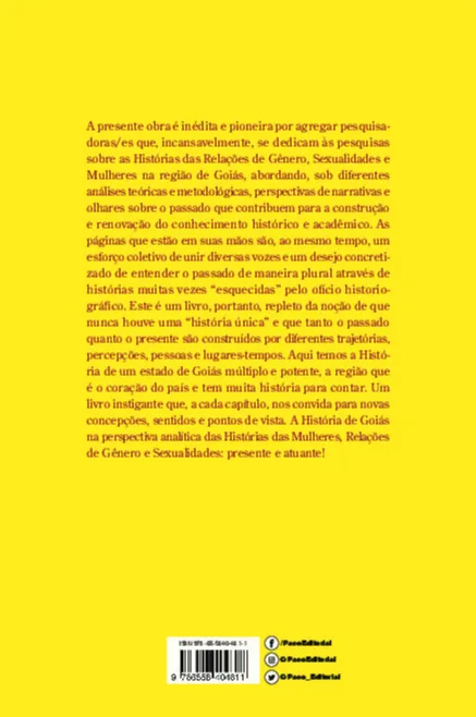 História das Mulheres, Relações de Gênero e Sexualidades em Goiás, apresenta pesquisas focadas nas Histórias das Relações de Gênero, Sexualidades e Mulheres, considerando a região de Goiás. Com abordagens teóricas e metodológicas diversas, os autores buscam imprimir perspectivas diversas de maneira que contribuam para a construção e renovação do tema no meio acadêmico. O objetivo é trazer ao leitor uma reflexão sobre a importância do passado e do presente na construção de trajetórias, olhares e percepções distintas, anulando a ideia de “história única”.