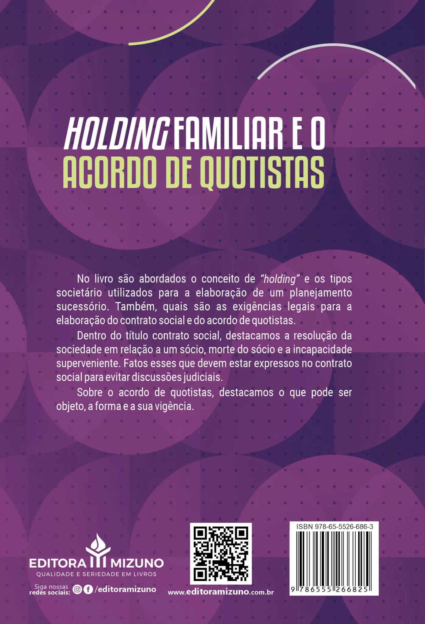 No livro são abordados o conceito de “holding” e os tipos societário utilizados para a elaboração de um planejamento sucessório. Também, quais são as exigências legais para a elaboração do contrato social e do acordo de quotistas.